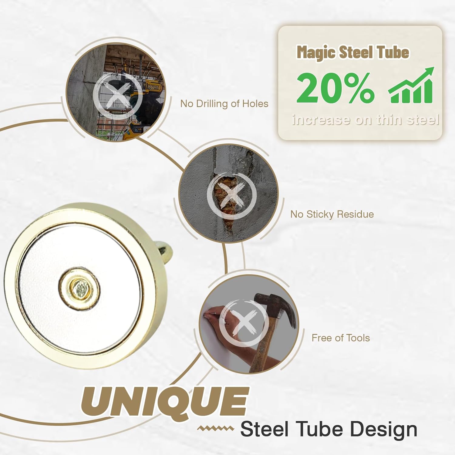 - ✔MAGIC STEEL TUBE DESIGN - Unique design of steel tube inside the base of magnetic hooks greatly increases the attractive force , especially on thin steel! It increase approximately 20% force comparing those none-tube magnets. it solves the problem of weak force on thin steel. Permanent magnetic hook with magic steel tube, strong magnetism lasts forever!