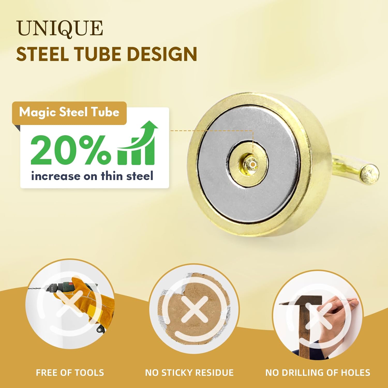 - ✔MAGIC STEEL TUBE DESIGN - Unique design of steel tube inside the base of magnetic hooks greatly increases the attractive force , especially on thin steel! It increase approximately 20% force comparing those none-tube magnets. it solves the problem of weak force on thin steel. Permanent magnetic hook with magic steel tube, strong magnetism lasts forever!