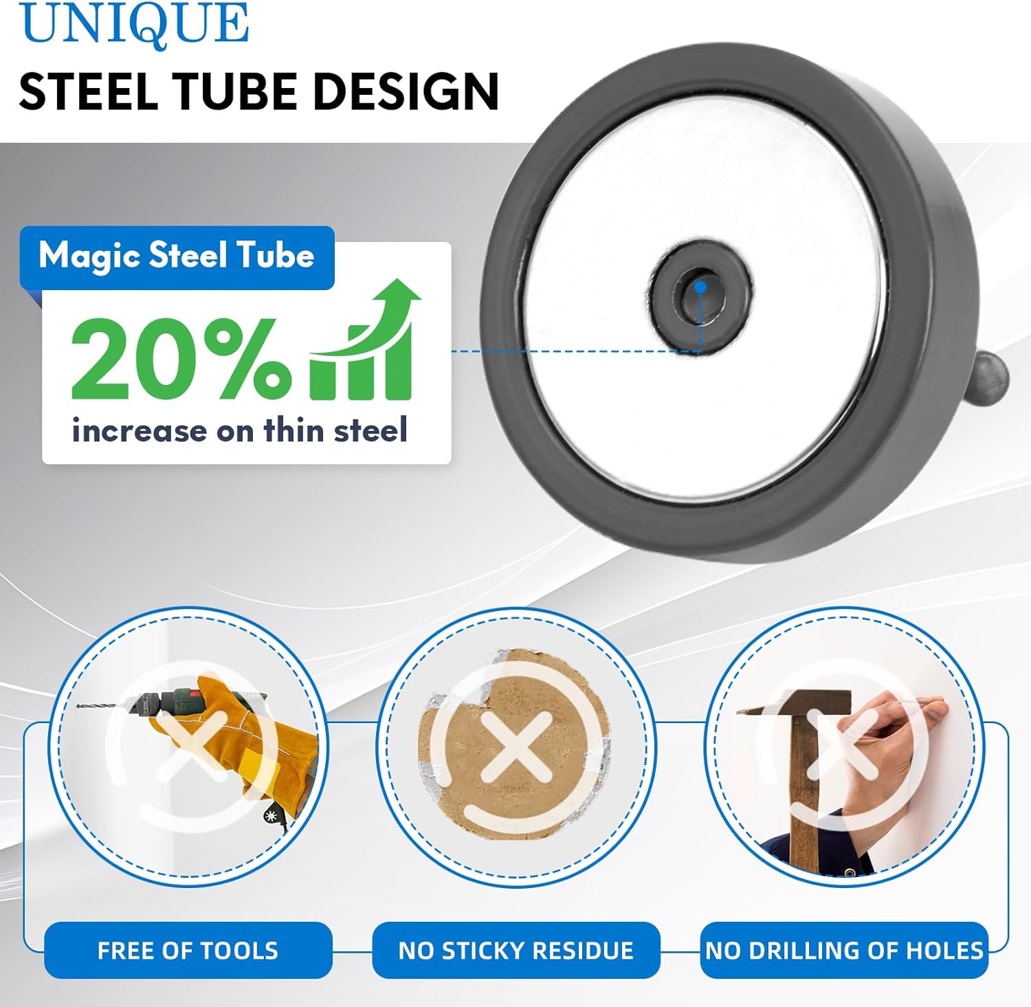 - โMAGIC STEEL TUBE DESIGN - Unique design of steel tube inside the base of magnetic hooks greatly increases the attractive force , especially on thin steel! It increase approximately 20% force comparing those none-tube magnets. it solves the problem of weak force on thin steel. Permanent magnetic hook with magic steel tube, strong magnetism lasts forever!
