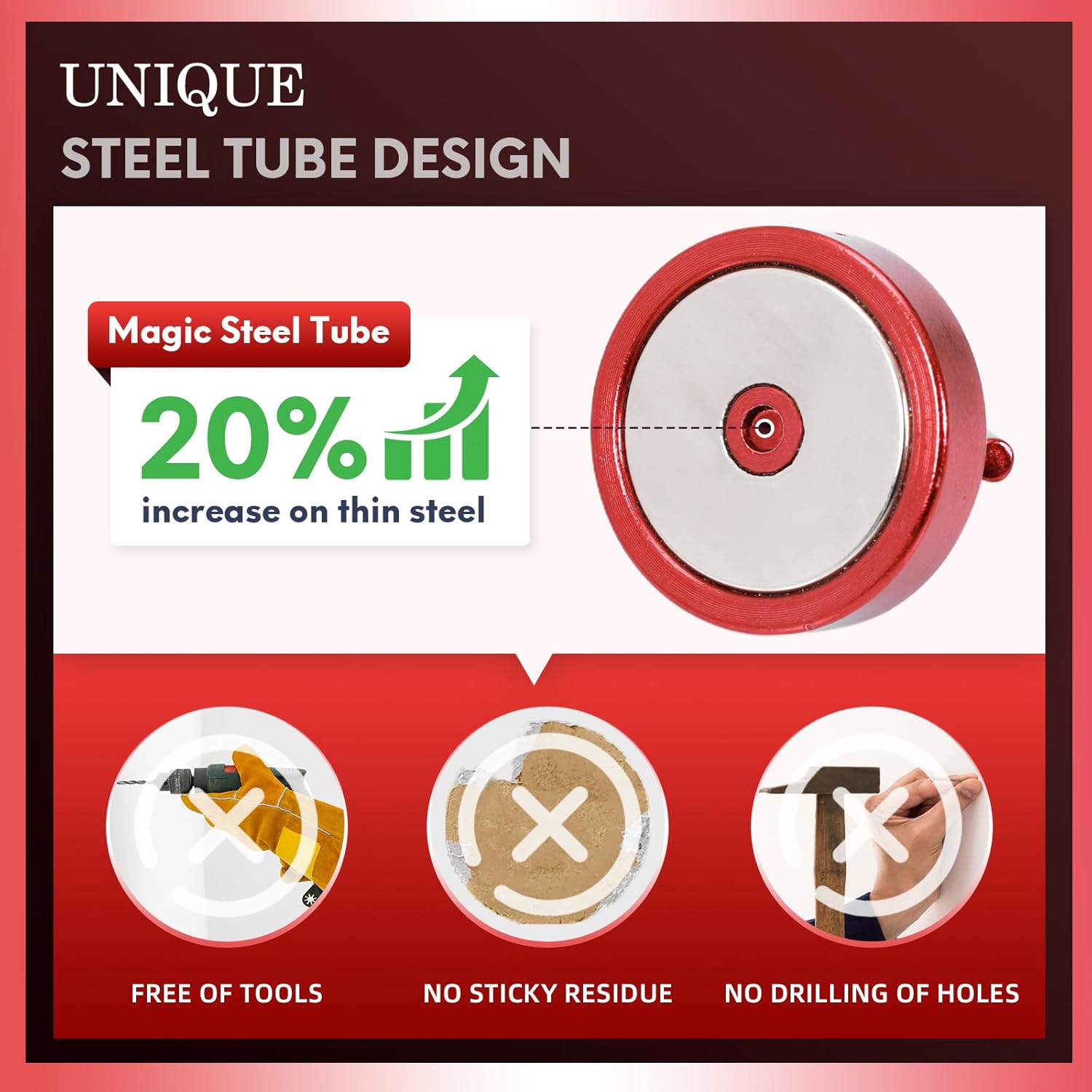 - โMAGIC STEEL TUBE DESIGN - Unique design of steel tube inside the base of magnetic hooks greatly increases the attractive force , especially on thin steel! It increase approximately 20% force comparing those none-tube magnets. it solves the problem of weak force on thin steel. Permanent magnetic hook with magic steel tube, strong magnetism lasts forever!