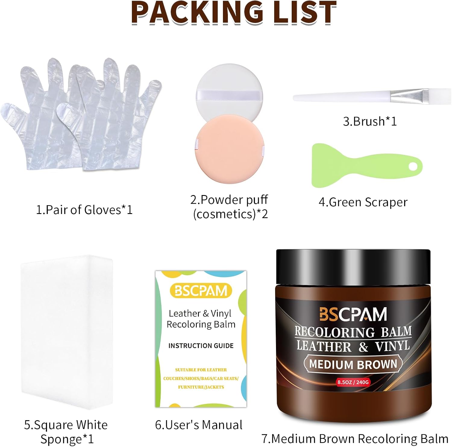 - Professional Leather Recoloring Balm: BSCPAM advanced leather repair gel is cream utilizes an advanced formula,effectively repairs scratches, cracks, and wear on the surface of leather, restoring its original appearance.Its special formula can penetrate the leather fibers, effectively repairing surface scratches, cracks, and wear while providing an additional protective layer to prevent future damage, helping to extend the lifespan of leather items