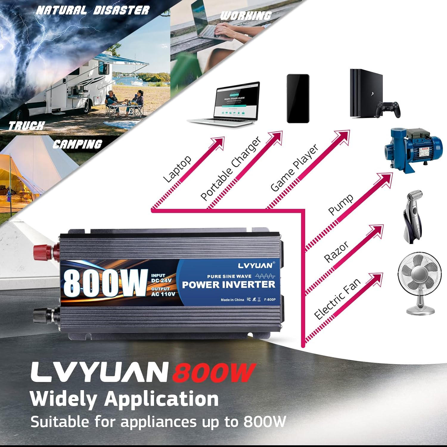 - COVERING A VARIETY OF OCCASIONS: LVYUAN pure sine power inverter is designed for various occasions such as home, camping, RV, car power adapter and emergency power.The 800W pure sine inverter is very suitable for electronic devices such as TVs, laptops, vacuum cleaners, refrigerators, etc.