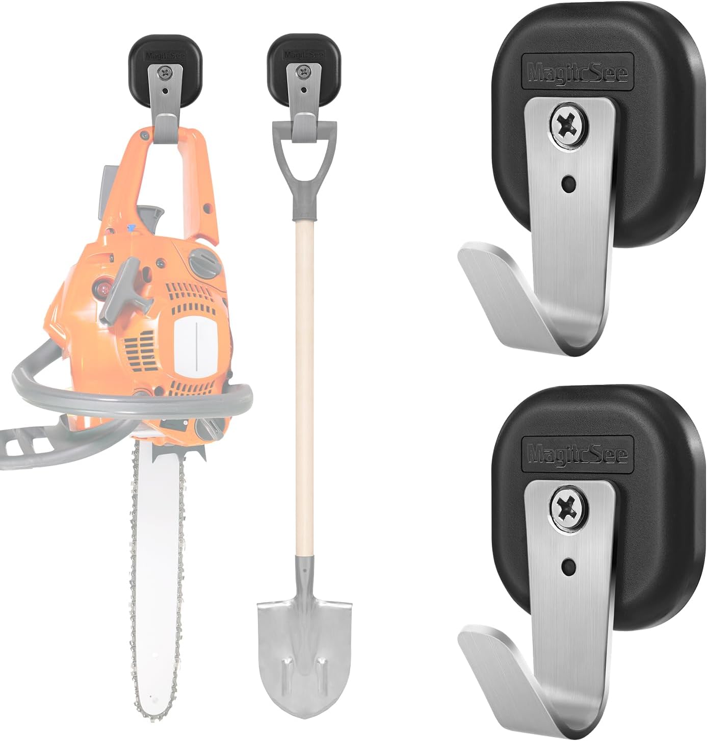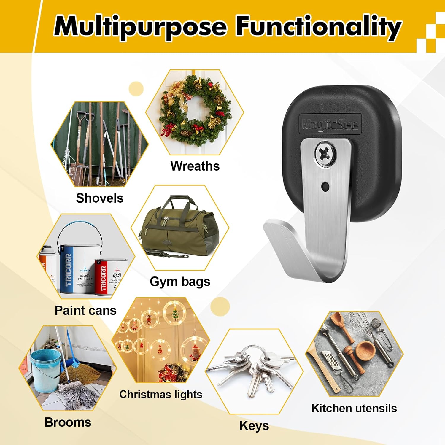 - Multipurpose Functionality: Hang and organize tools, shovels, paint cans, coats, hats, gym bags, mops, brooms, keys, kitchen utensils, wreaths, Christmas lights, and more, creating extra storage space wherever needed.