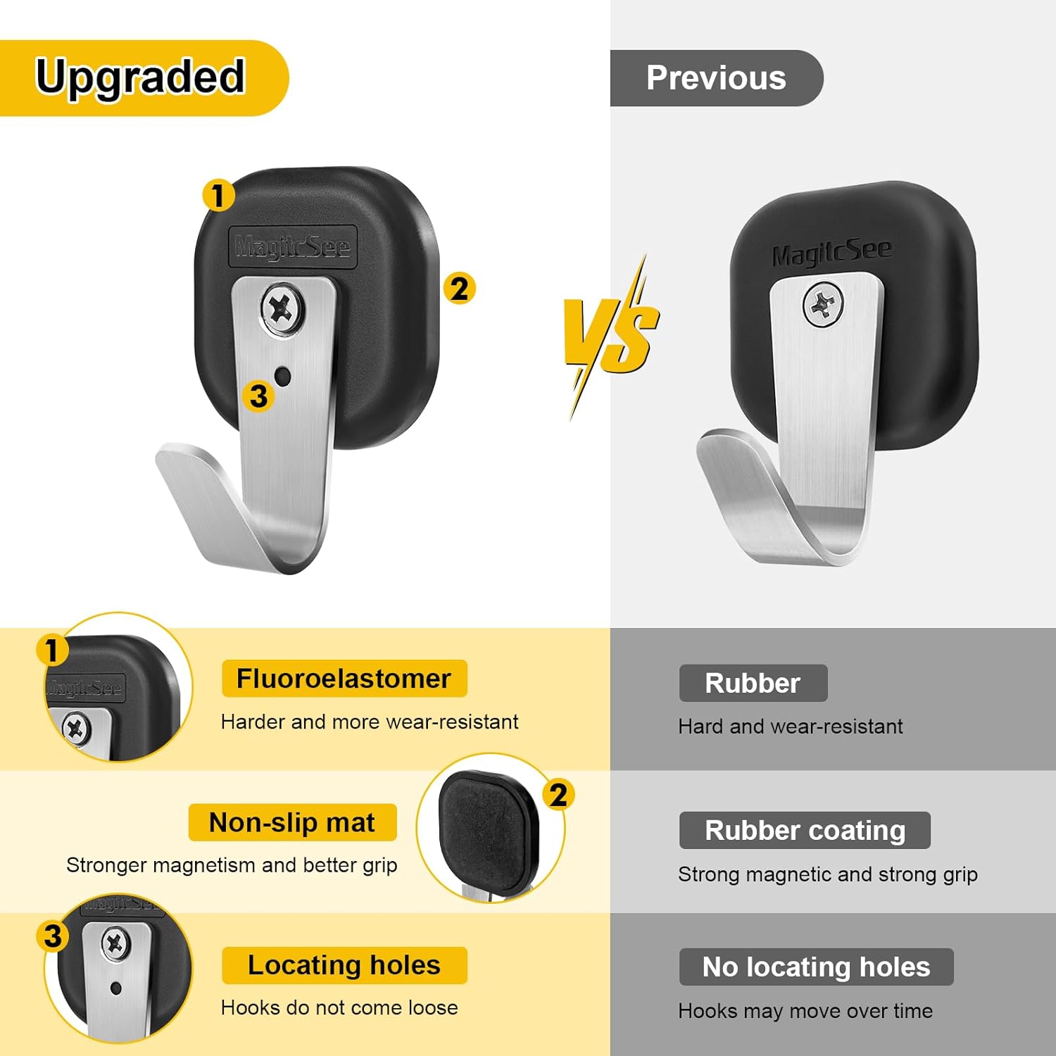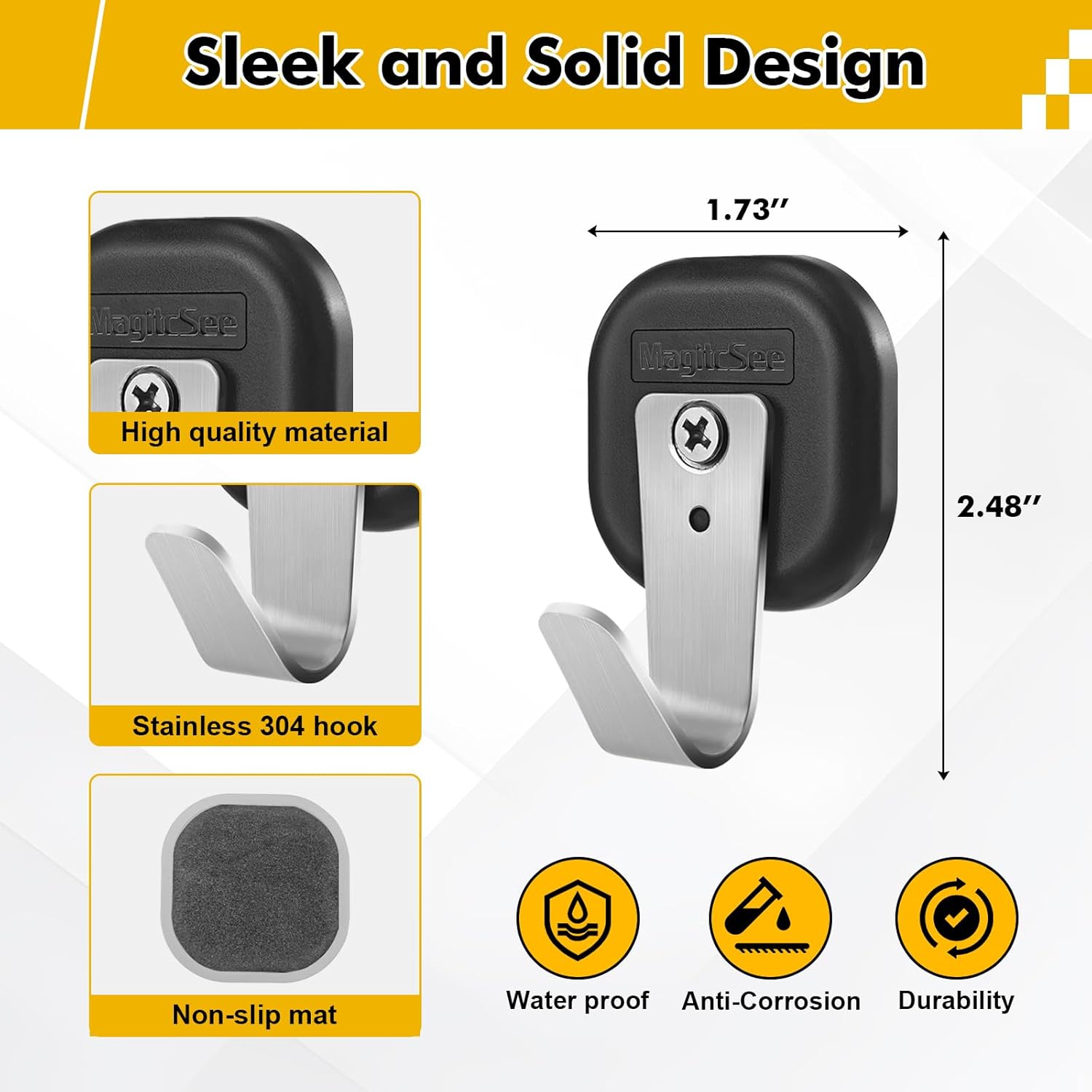 - Sleek and Solid Design: Crafted from the most powerful industrial neodymium iron with rubber coating , the stainless 304 hook with positioning holes in the center, can effectively prevent the hook from loosening and make its more durable.
