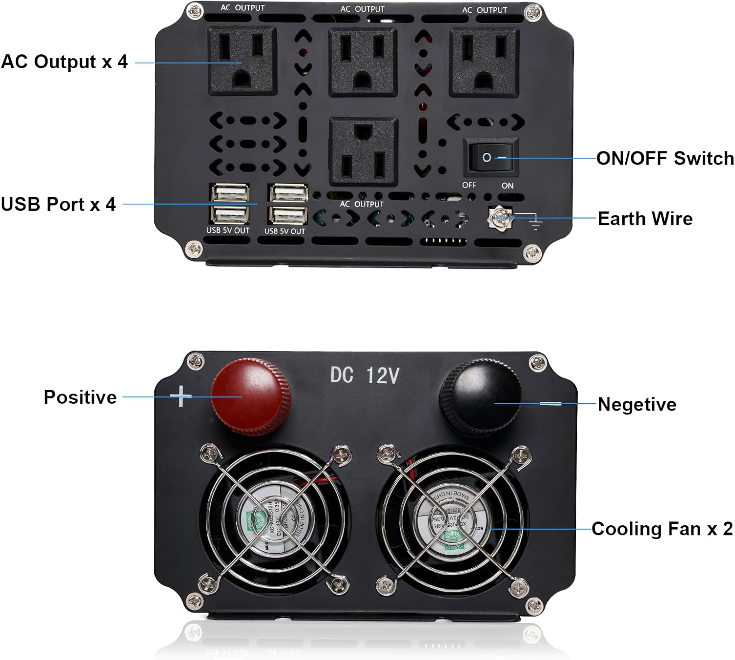 - Special Design: Durable aluminum body provides advanced protection and easier to cooling. Built-in temperature control cooling fan. Isolated Ground Neutral. Rugged construction allows power inverter stand up to harsh environments.