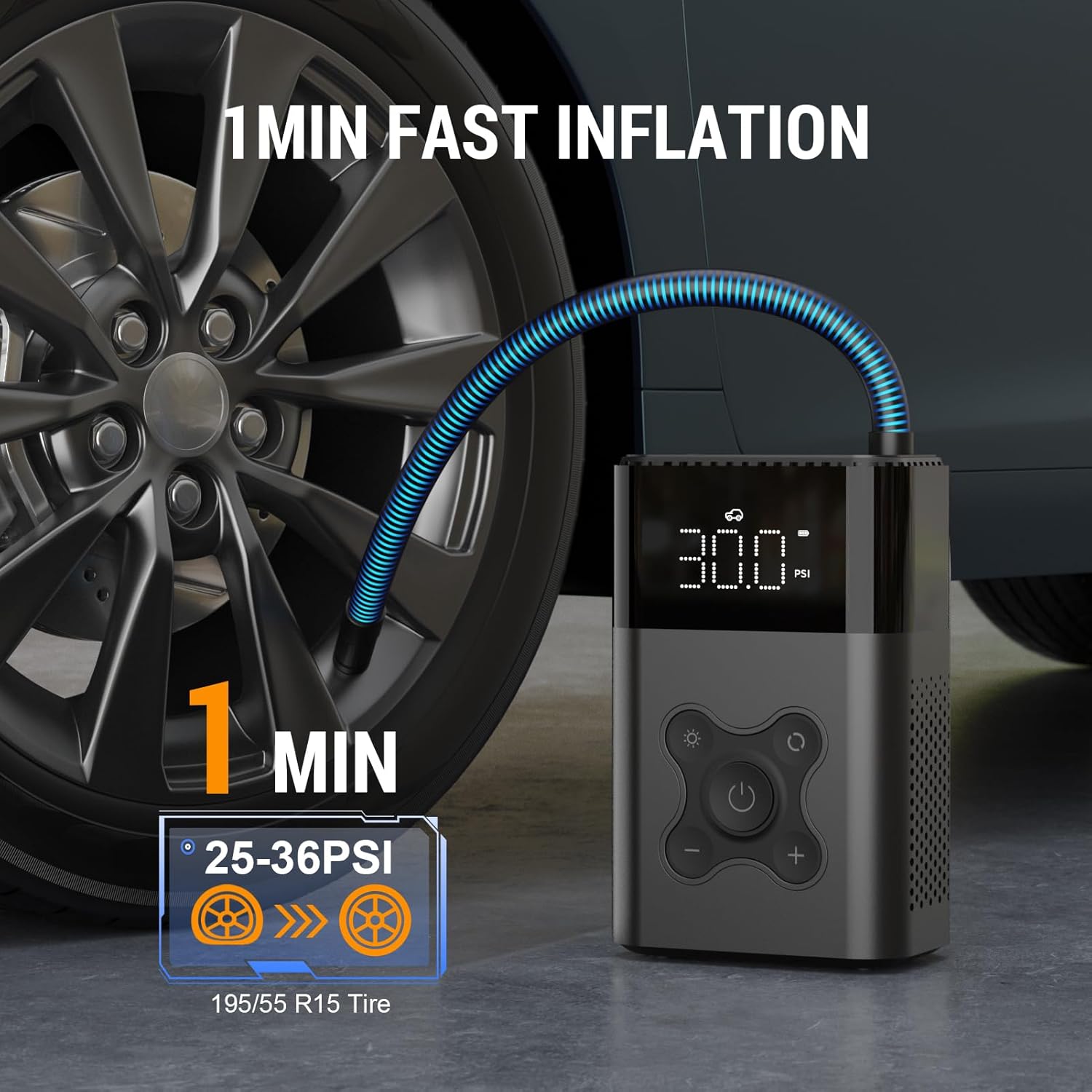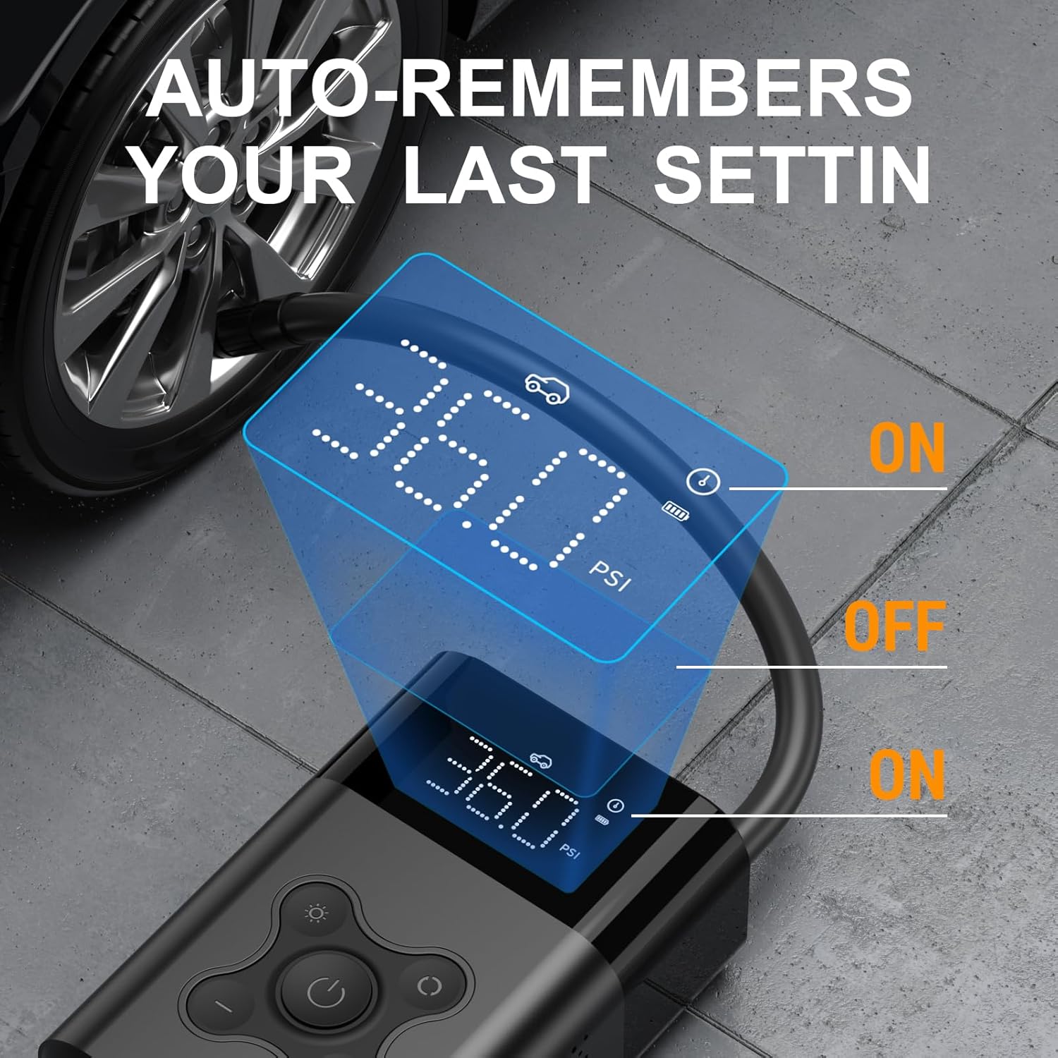 - Easy Use and Auto Shutoff:Using the portable tire inflator is as simple as pulling out the left end of the hose at the top to start it, and pushing it back in to turn it off. The pump will automatically stop once it reaches the preset pressure or after 3 minutes of inactivity