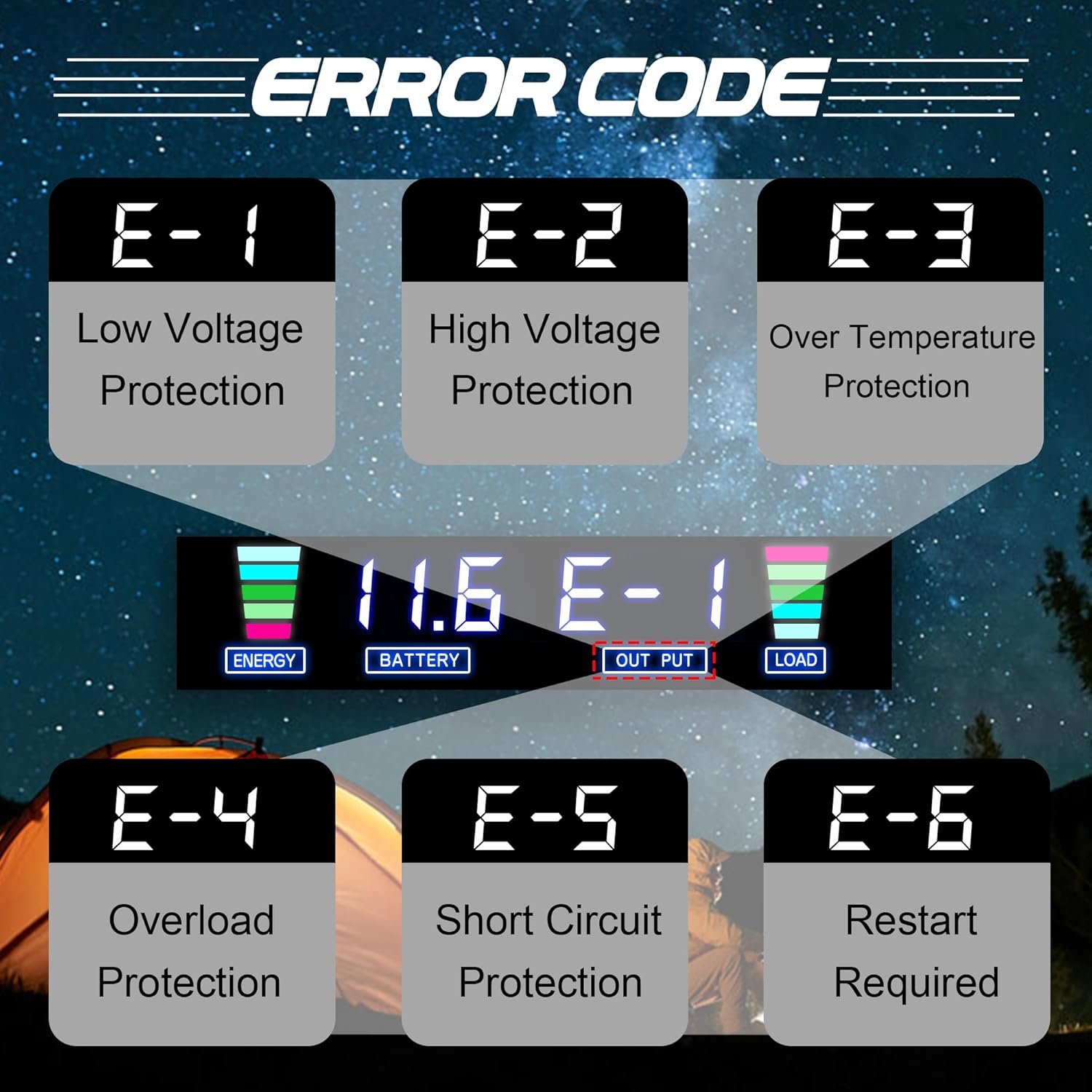 - INTELLIGENT LCD DISPLAY: In normal working state, the LCD Display will display the input/output voltage, battery capacity, load capacity and output frequency. When the inverter is in an abnormal state, the LCD Display will display the abnormal code. Such as, E-1: Low Voltage Protection, E-2: High Voltage Protection, E-3: Overtemperature Protection, E-4: Overload Protection, E-5: Short Circuit Protection, E-6: Repeated Faults Shutdown, Restart Required.