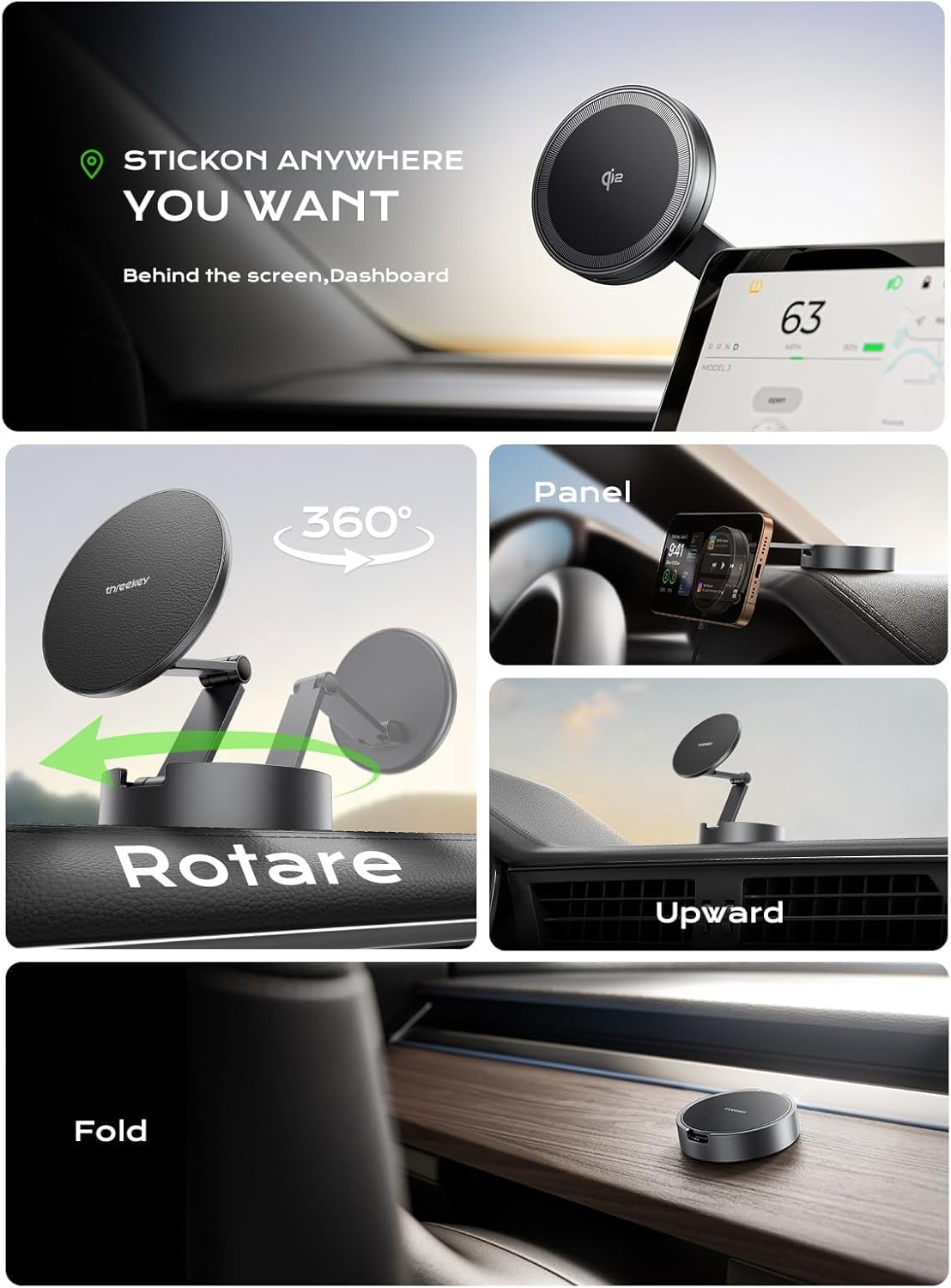 - 【Detachable Wireless Charger with Qi2-Certified 15W Fast Charging】The dual-sided magnetic charging pad attaches securely to the mount or works independently for charging.Qi2 certified and MagSafe compatible with 15W powerfor precise alignment and safe, fast charging, eliminating low battery worries. Note: Use an 18W, 20W, or higher power adapter to achieve optimal charging efficiency (adapter not included).