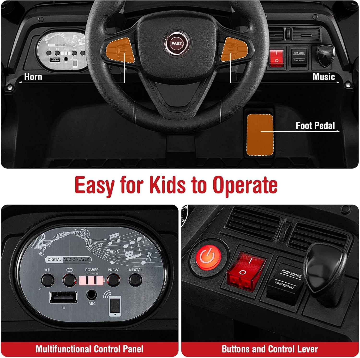 - 【2 Control Ways for Option】 Children can enjoy authentic driving experience with the steering wheel, foot pedal, and control lever. Alternatively, parents can use the remote control to supervise the car for added safety. In both modes, the car can move forward, backward, left, and right for unlimited driving enjoyment. Speed range: 1.2-3.1 mph.