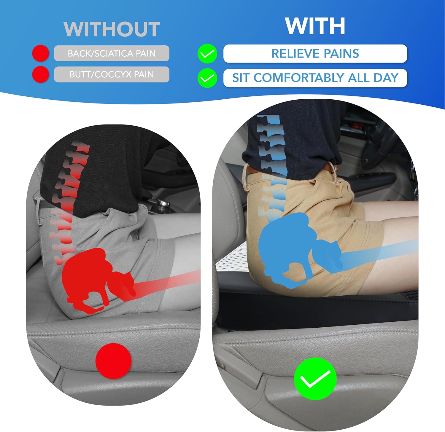 - Ergonomic Butt Pillow Relieves Sciatica Pain - Great car cushion alleviates tailbone pressure, providing support for the lower back and buttocks. Effectively eases pain in the sciatica, tailbone, hip, orthopedic etc. Ideal for those who sit for prolonged periods, such as drivers, truckers, office workers, promoting a healthy posture