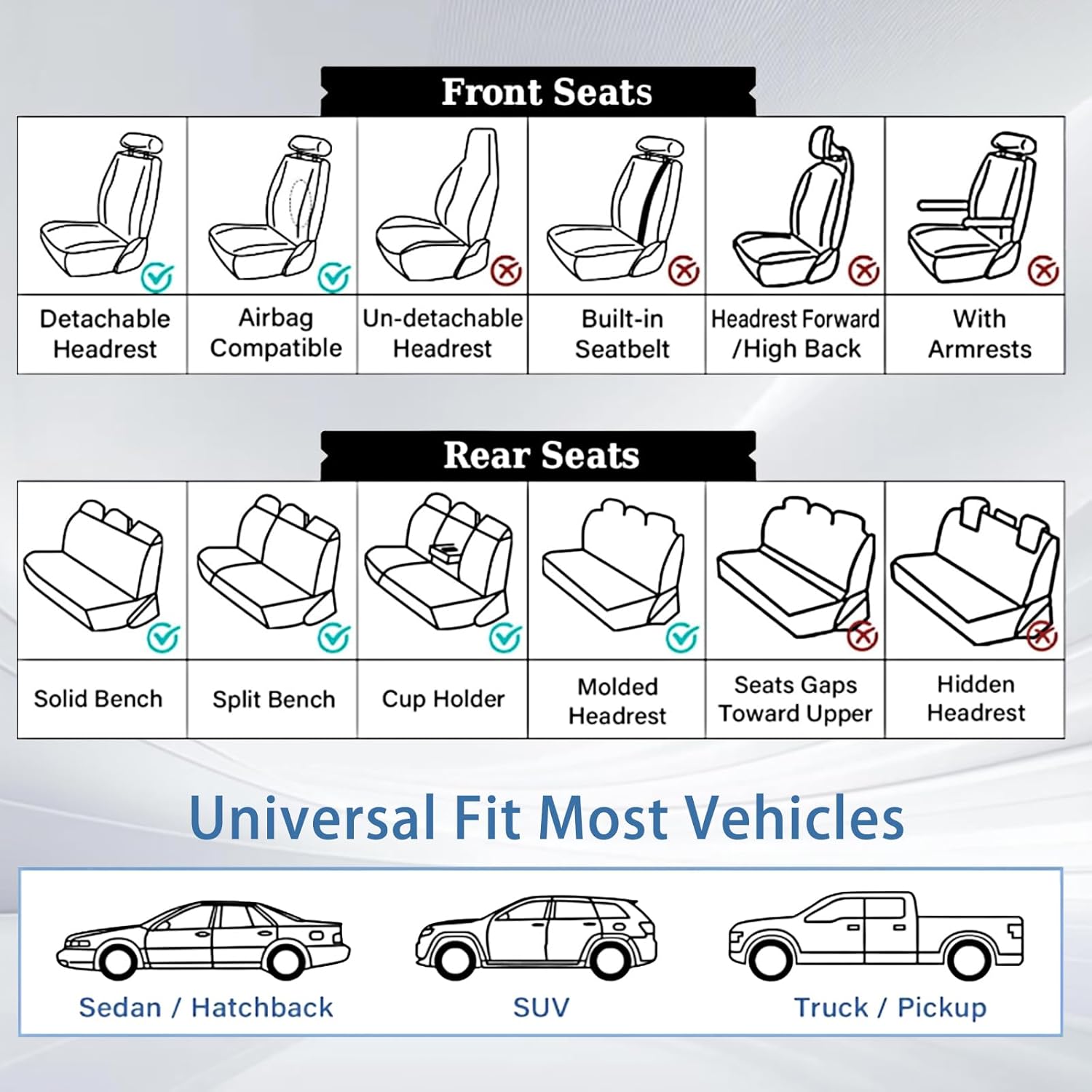 - UNIVERSAL FIT: The seat covers are compatible with most cars, SUV, pick-up and trucks. Unfold the car seat covers package, you will get 2 front seat covers. Once put on seat covers, the vehicle interior atmosphere instantly becomes high-end and atmospheric. You will immediately fall in love with faux leather car seat covers. Note: Car seat covers don't fit seats with fixed armrest.