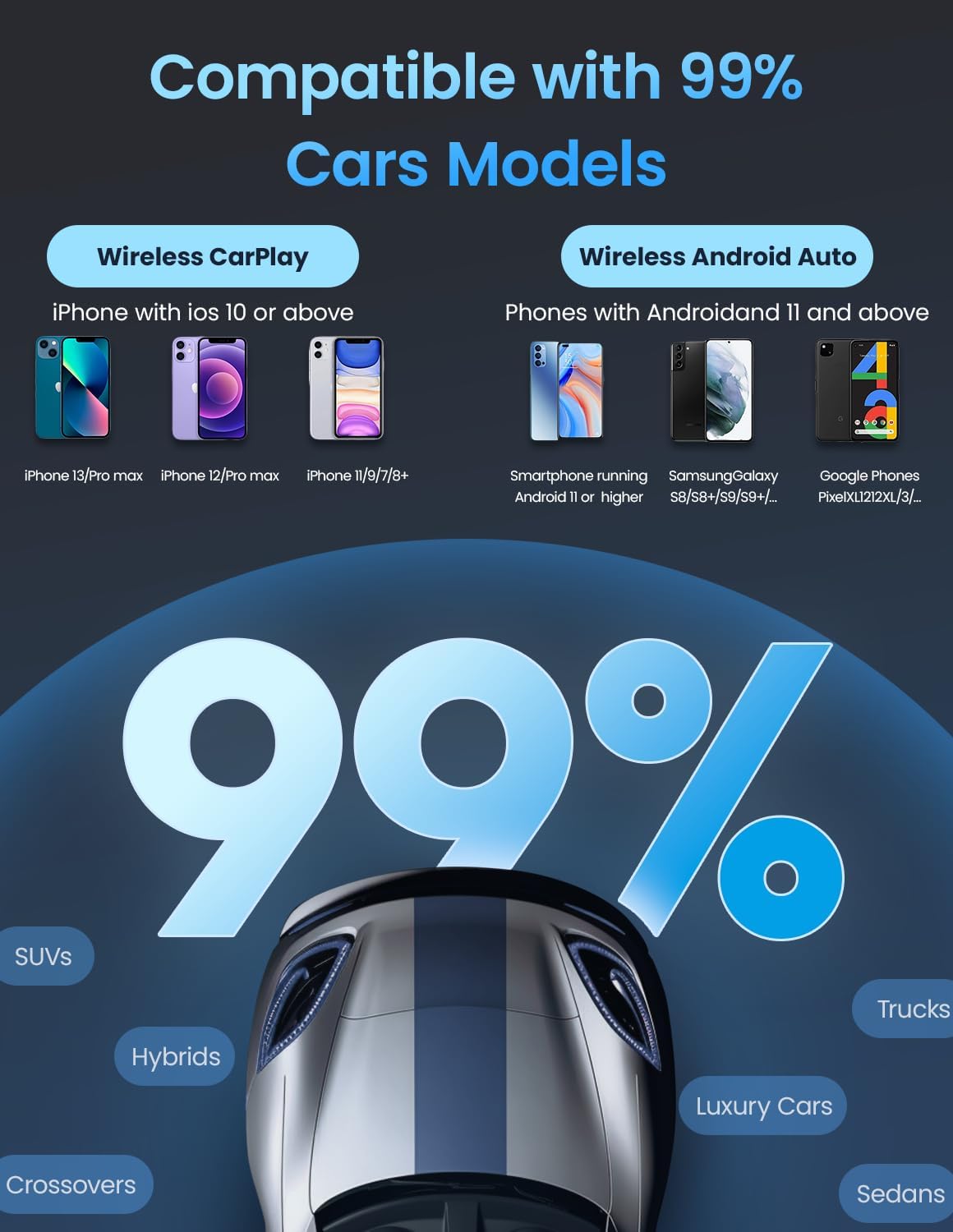 - 🚙【Compatible Models】 : Kello's carplay wireless dongle is Compatible with 2018-2024 cars featuring factory wired CarPlay, including Ford F-150, Chevy Silverado, RAM, Toyota, and Honda. Check our full compatibility list to ensure a perfect fit for your vehicle. This wireless carplay is available for iPhone 6 and up, iOS 10 and up, and Android 11 and up. Wireless carplay is made of special materials that dissipate heat and are safe and durable, so that you can drive easily and away from all the worries of using the product.
