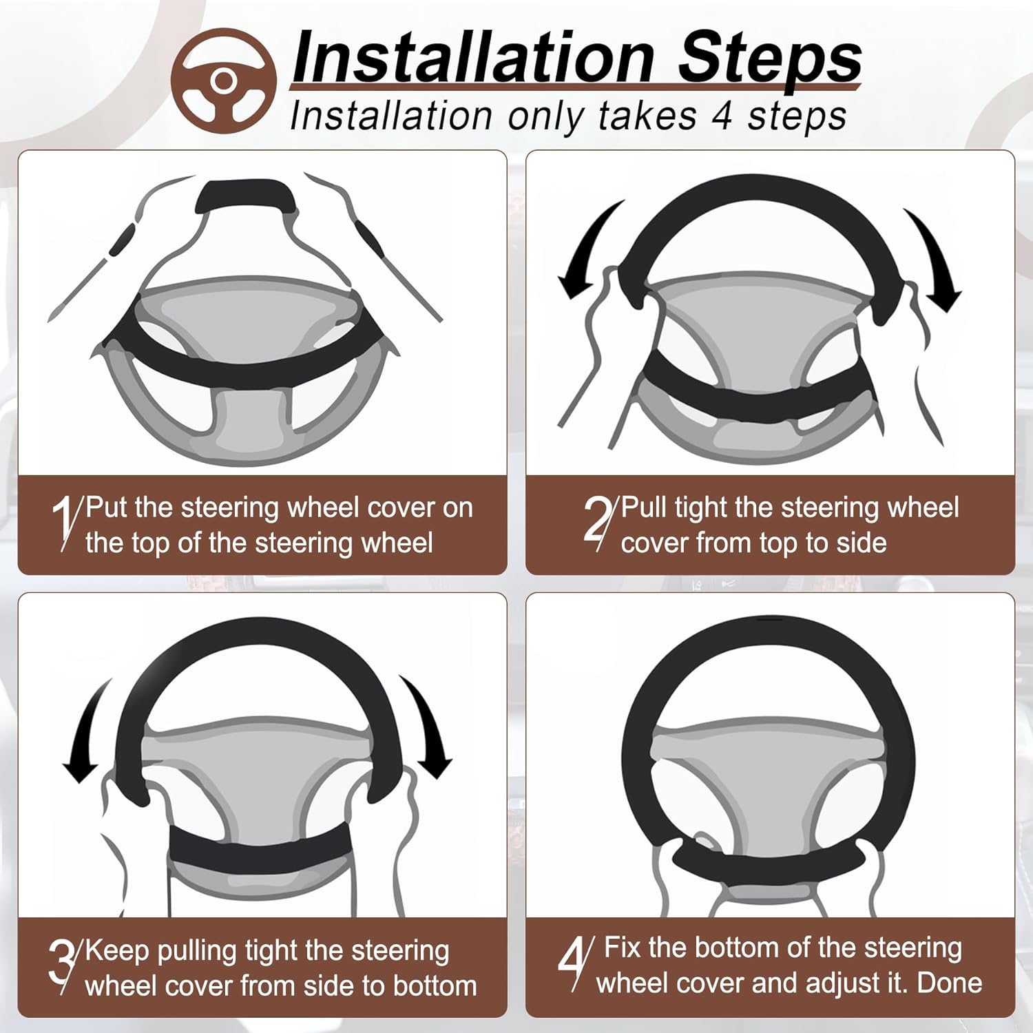 - 【Easy to install】: Because of the elastic stretch rubber band, Any adult can easy install this steering wheel cover, no tools required.