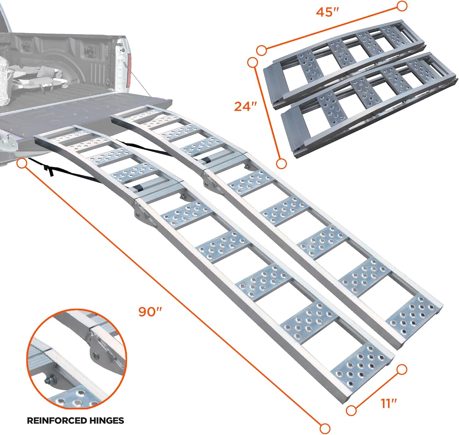 - GENEROUS LENGTH FOR EASE OF USE: Each ramp is 90 inches long, providing the perfect length for smoother, safer loading, even for higher vehicles (up to 42” tailgate height).