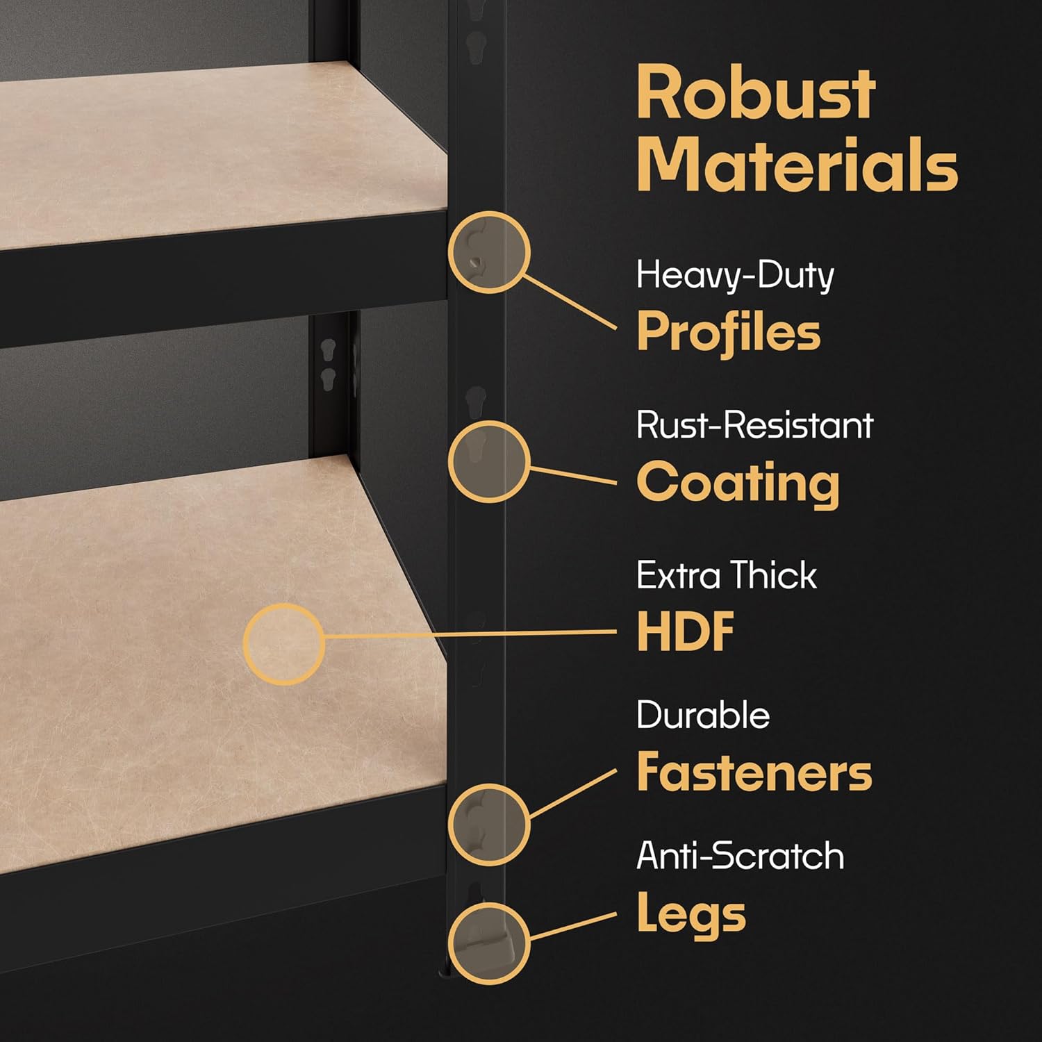 - PROPERLY STRONG AND DURABLE. Rely on this shelving to unfailingly hold your heavy possessions. All these metal shelves have extended profiles and rust-resistant coating. The heavy duty shelves themselves are extra thick HDF and come with robust bolts and rivets.