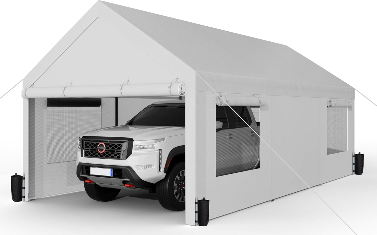 Shintenchi Carport 10' x 20' Heavy Duty Portable Garage, Car Port Canopy with Side-Opening Removable Door & Roll-Up Windows, Car Canopy for Truck,Car,Boat,Motorcycle,White