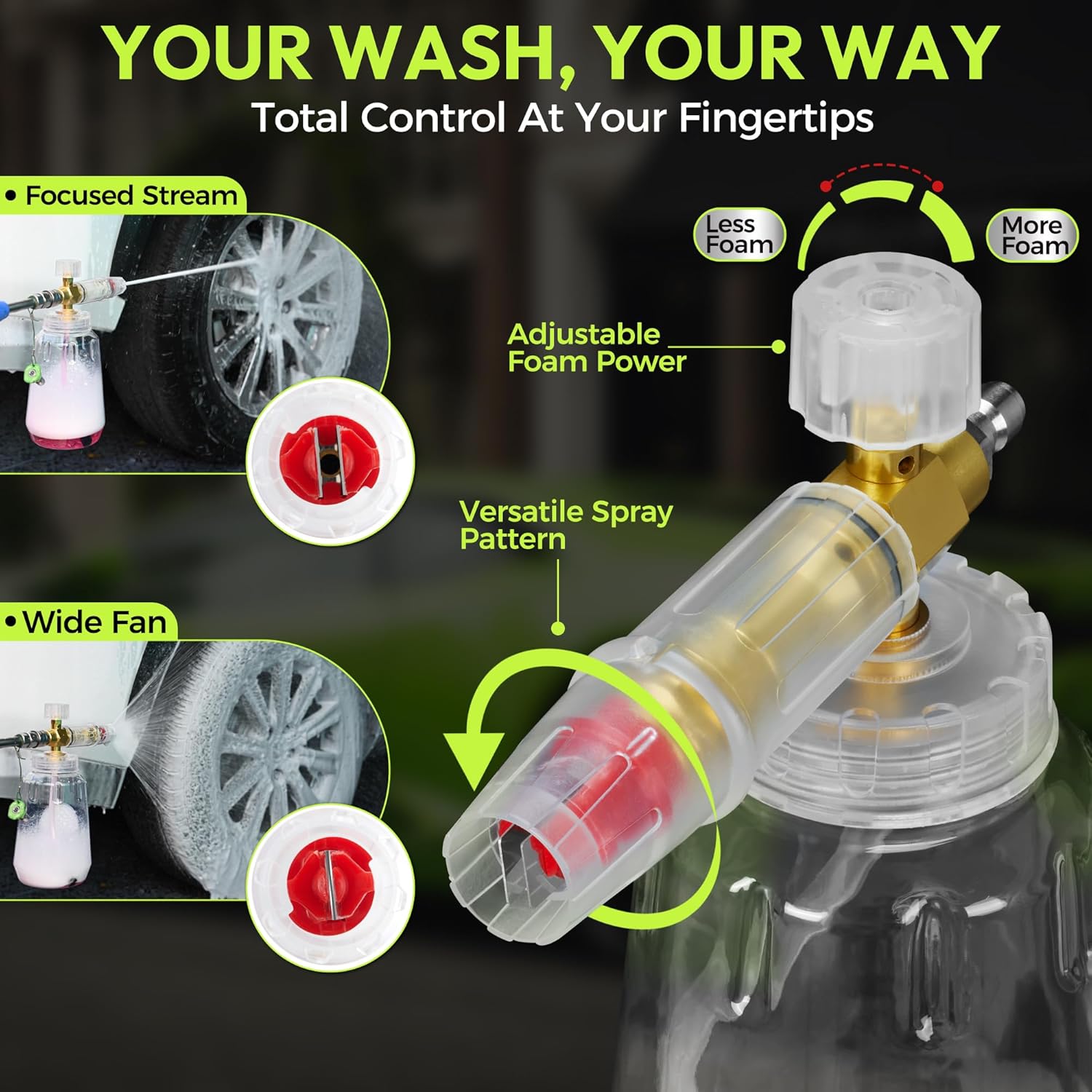 - ๐โจ๐ง๐ฎ๐ถ๐น๐ผ๐ฟ๐ฒ๐ฑ ๐๐ผ๐ฎ๐บ ๐ ๐ฎ๐๐๐ฒ๐ฟ๐-- Take full control with dual-adjustment features: The rotating nozzle switches from wide fan to targeted stream, while the foam knob lets you dial in car wash foam gun precisionโthick suds for muddy trucks or light mist for delicate paint. This foam cannon adapts like a pro-grade tool for every wash scenario.
