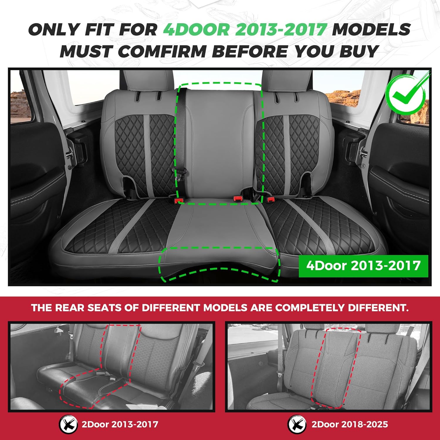 - 【Custom Car Seat Covers】: Precision cut and custom tailored to "2015 Wrangler Unlimited Sahara 4DR SUV" for a glove-like fit. Exclusively designed for Jeep Wrangler Seat Covers 4Door 2013 2014 2015 2016 2017, since they have the same or similar seat size.