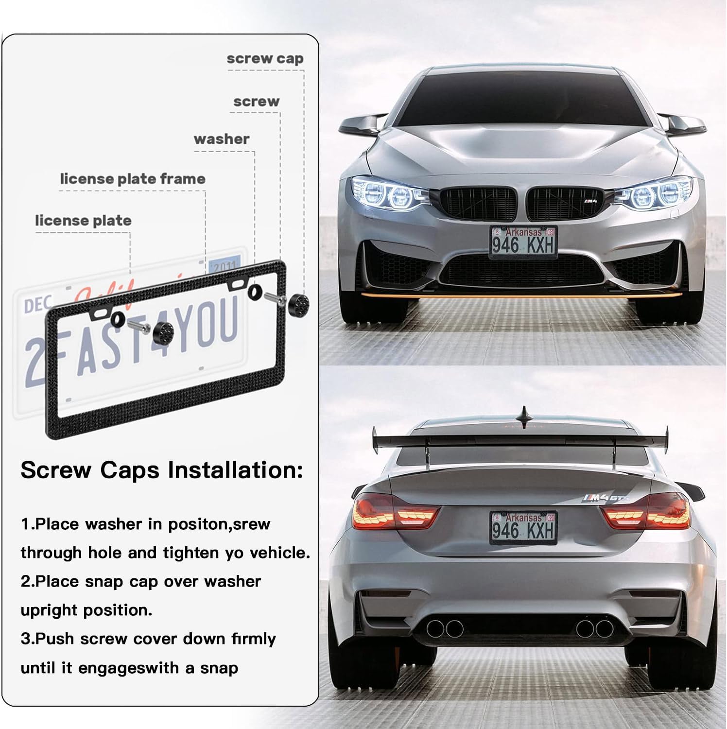 - 【Easy Installation】: Without special tools required, it can easily be installed within minutes. The license plate frame also comes with 2 screw caps which fully decorate your plate and make the plate security. The 2 pre-drilled holes on the plate secure a good fit,preventing any rattling noises during driving