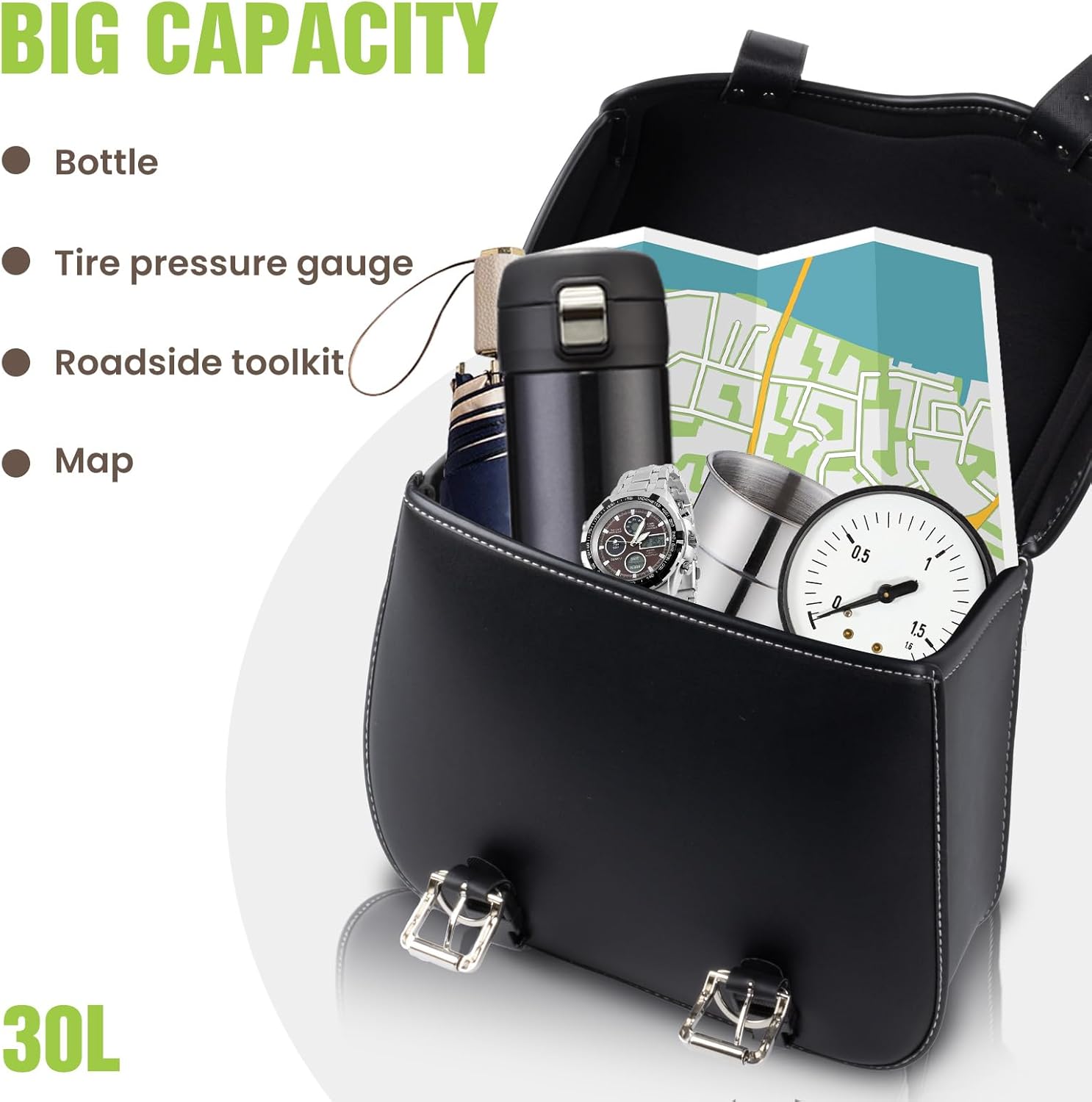 - 【30L LARGE CAPACITY】 AceRide motorcycle saddlebags size is 13.58 *6.69 *10.8 in. Enough room to store some regular stuff. Such as Cups, Drinks, Gloves, Jackets, Wallets, Earphones, Power Banks, Raincoats, Groceries, Tools, or other daily necessities to meet your demands for commuting and short vacations.