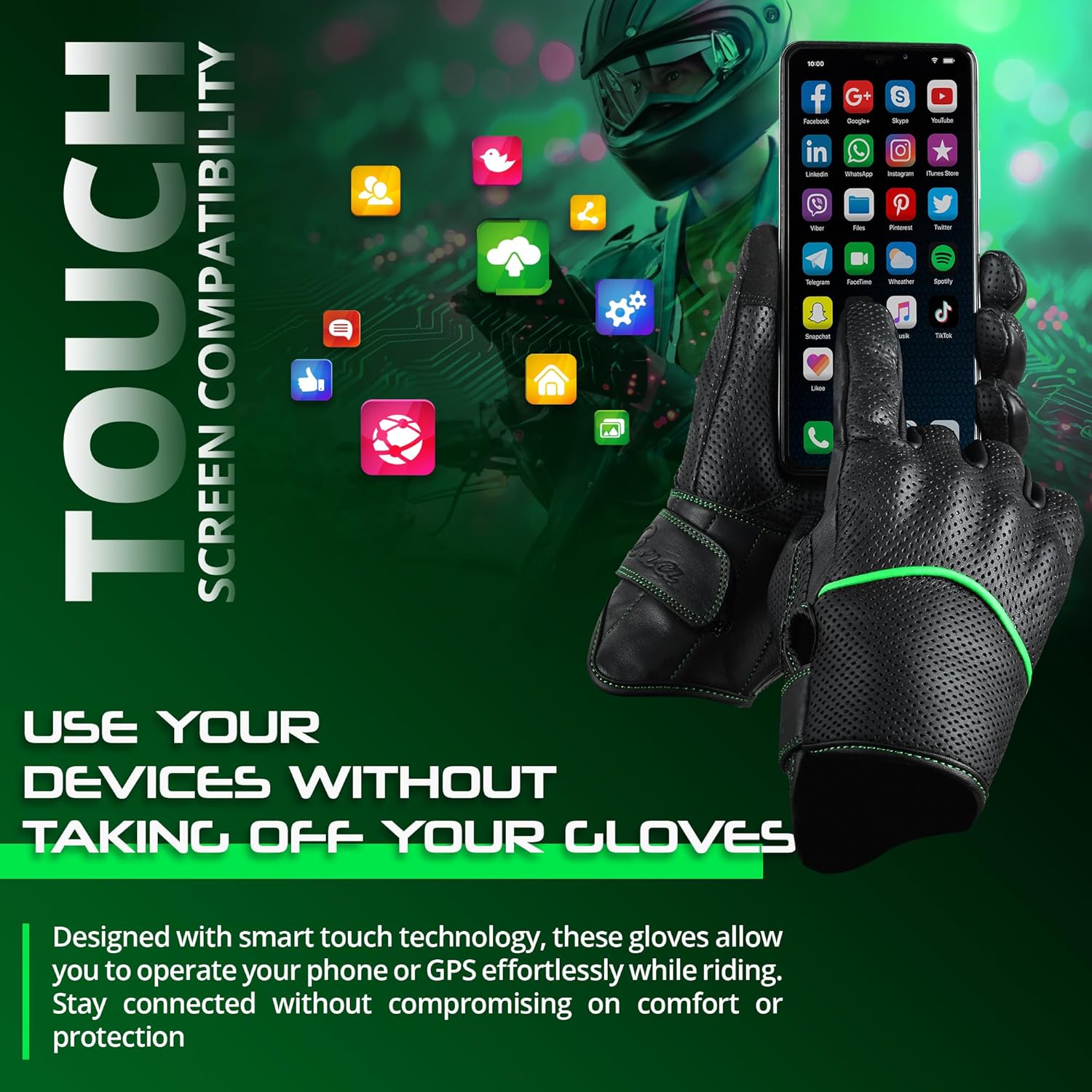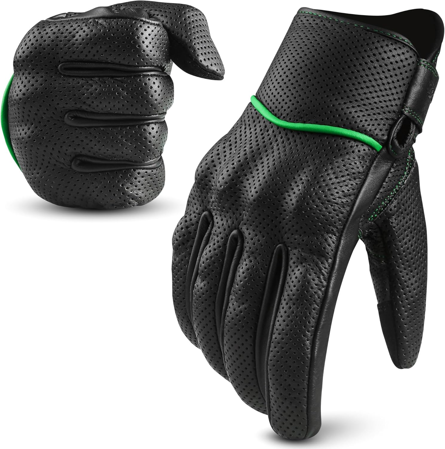 - LEATHER MOTORCYCLE GLOVES - aaasportx black greenMotorcycle Gloves are made of Genuine Leather. Our Lightweight Motorcycle Gloves ensures durability through a variety of situations. aaasportx Motorcycle Gloves for Men offer a high-quality, stylish, and durable finish that excludes sophistication and toughness on the road.