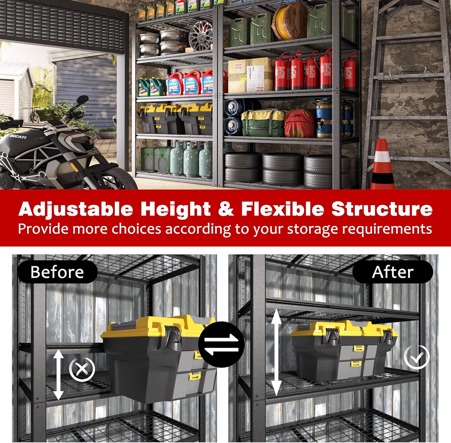 - Adjustable Shelves: These garage storage shelves are made of high-quality thick MDF boards and thicken metal steel frame with black powder coating. It is customizable with 1.58" increments to fit short and tall items.
