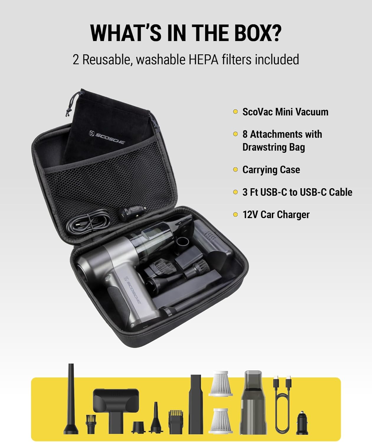 - Included Components : (8) Attachments, Accessory Bag, Protective Carrying Case, SCOVAC High Power Cordless Mini Vaccum & Duster, USB-C to USB-C Cable and Car Charger (8) Attachments, Accessory Bag, Protective Carrying Case, SCOVAC High Power Cordless Mini Vaccum & Duster, USB-C to USB-C Cable and Car Charger