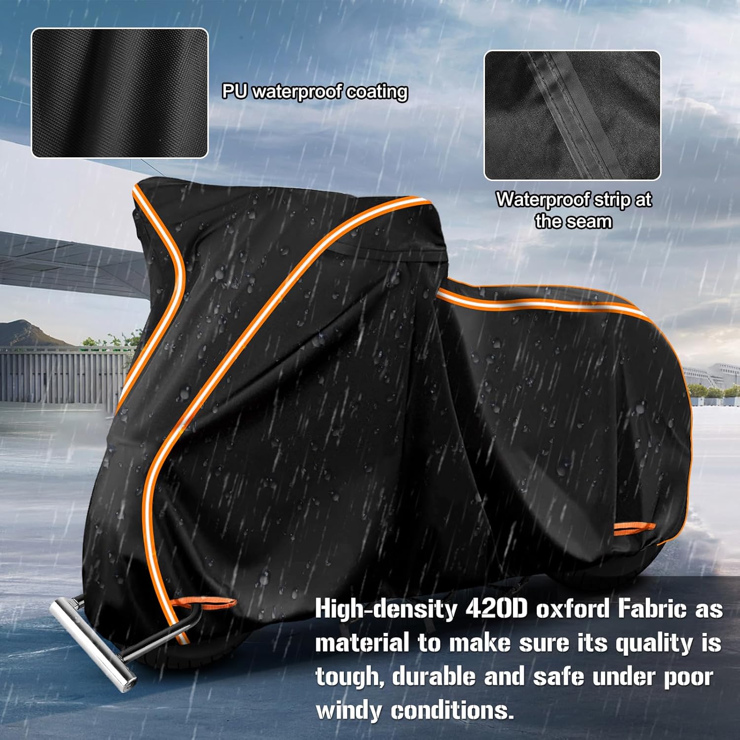 - ăHOW ABOUT THE DETAILSă1. Left and right sides each have a ventilation hole, which can prevent moisture under the cover. 2.Black PU waterproof coating: UV protection, high temperature protection, preventing the interior leather and plastic from cracking and deteriorating. 3. Two full orange reflective strips to prevent collision at night and also help you find your motorcycle at a glance. 4. Anti-theft locking holes on the front wheel, perfect protection for your motorcycle, don't worry about losing your motorcycle.