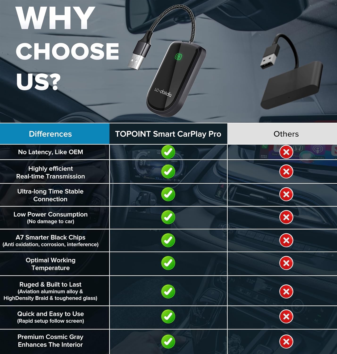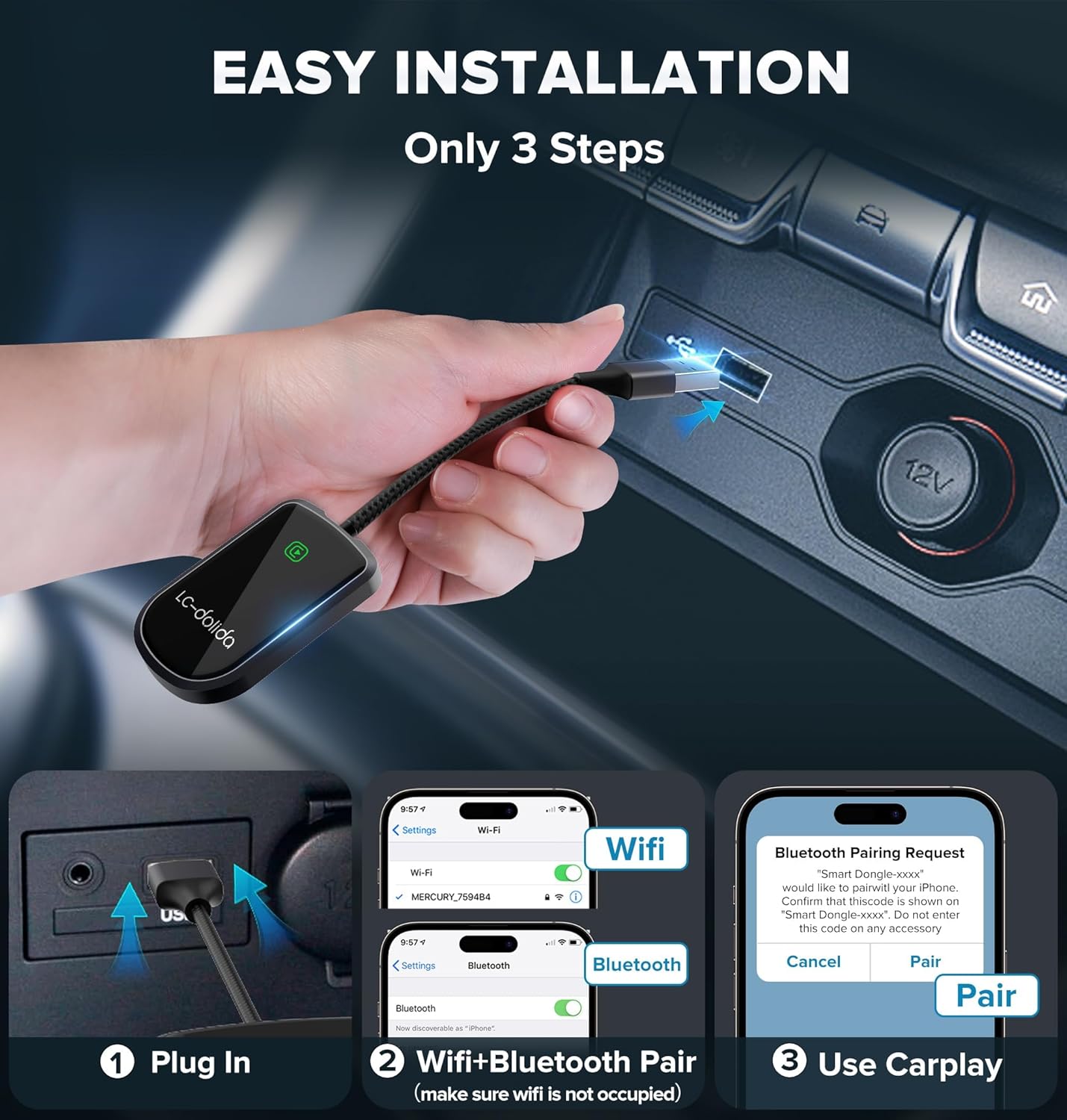 - Effortless Wireless CarPlay Conversion:Transform your wired CarPlay into a wireless experience with just a simple plug-and-play setup. No additional apps or complicated installations are needed. Once connected, the adapter automatically pairs with your iPhone, providing instant access to navigation, music, Siri, and more—all without the hassle of tangled cables.