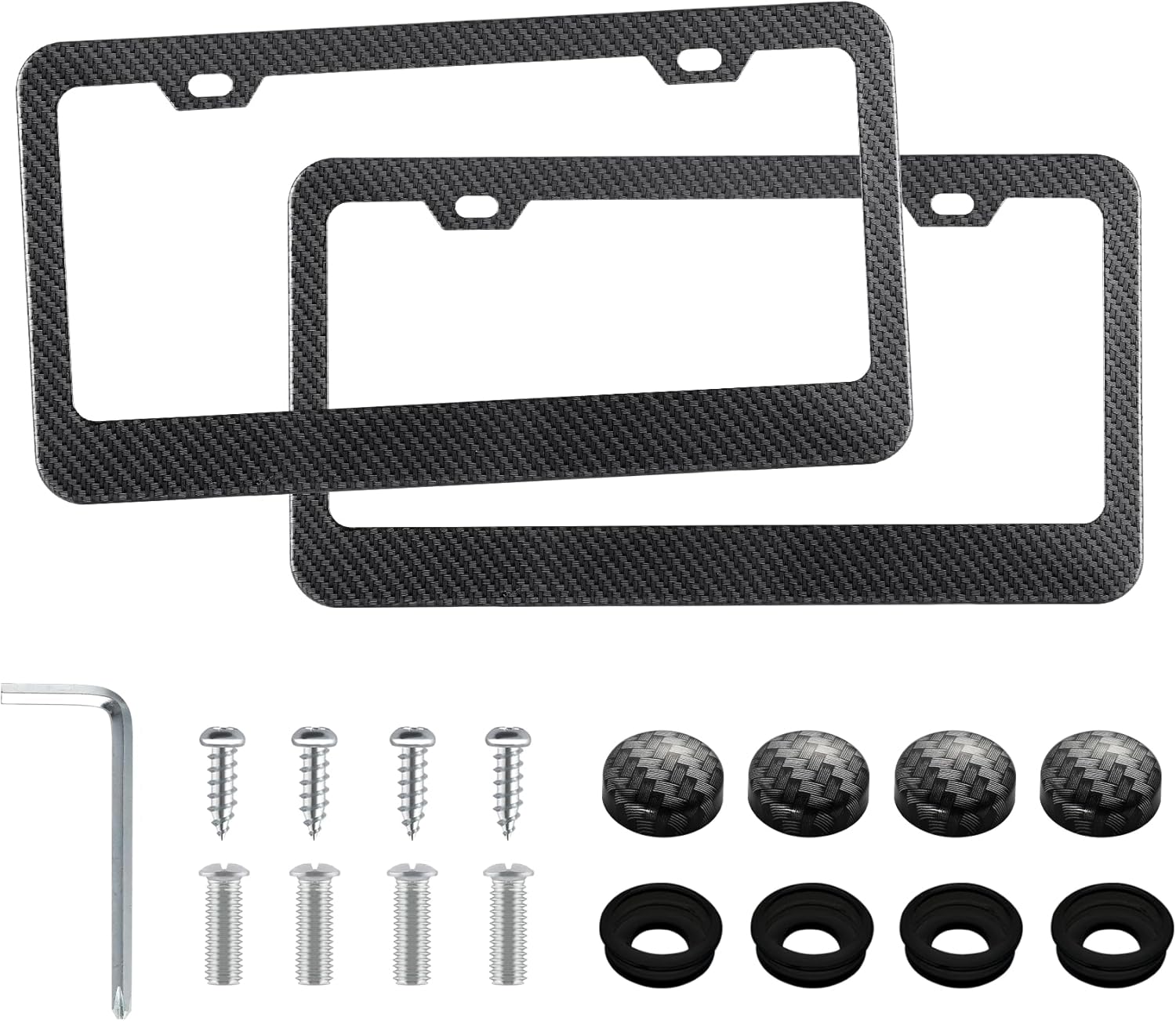 - 【Complete Installation Kit】 Includes 2 license plate frames and all the necessary accessories: 8 plastic screw caps, 8 plastic washers, 8 machine screws, 4 self-tapping screws, and 1 screwdriver. This all-in-one kit ensures easy and secure installation.