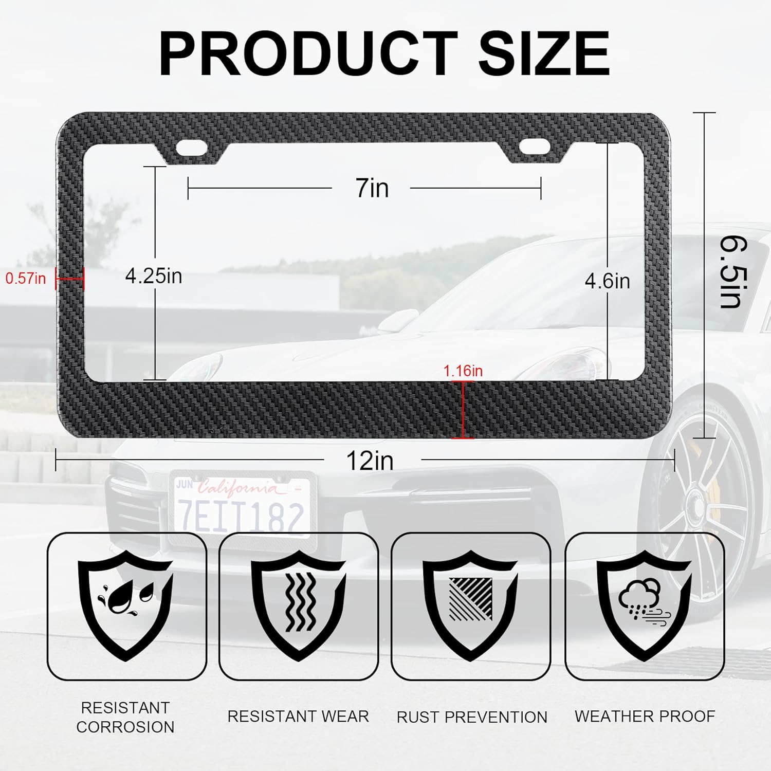 - 【Universal Fit】Measuring 12 inches x 6.5 inches with an inner size of 10.86 inches x 4.6 inches, these frames fit most standard US license plates. Four pre-drilled holes ensure compatibility with various vehicle models without the need for modifications. Note: Some cars have only 2 holes, so please check your vehicle before ordering.