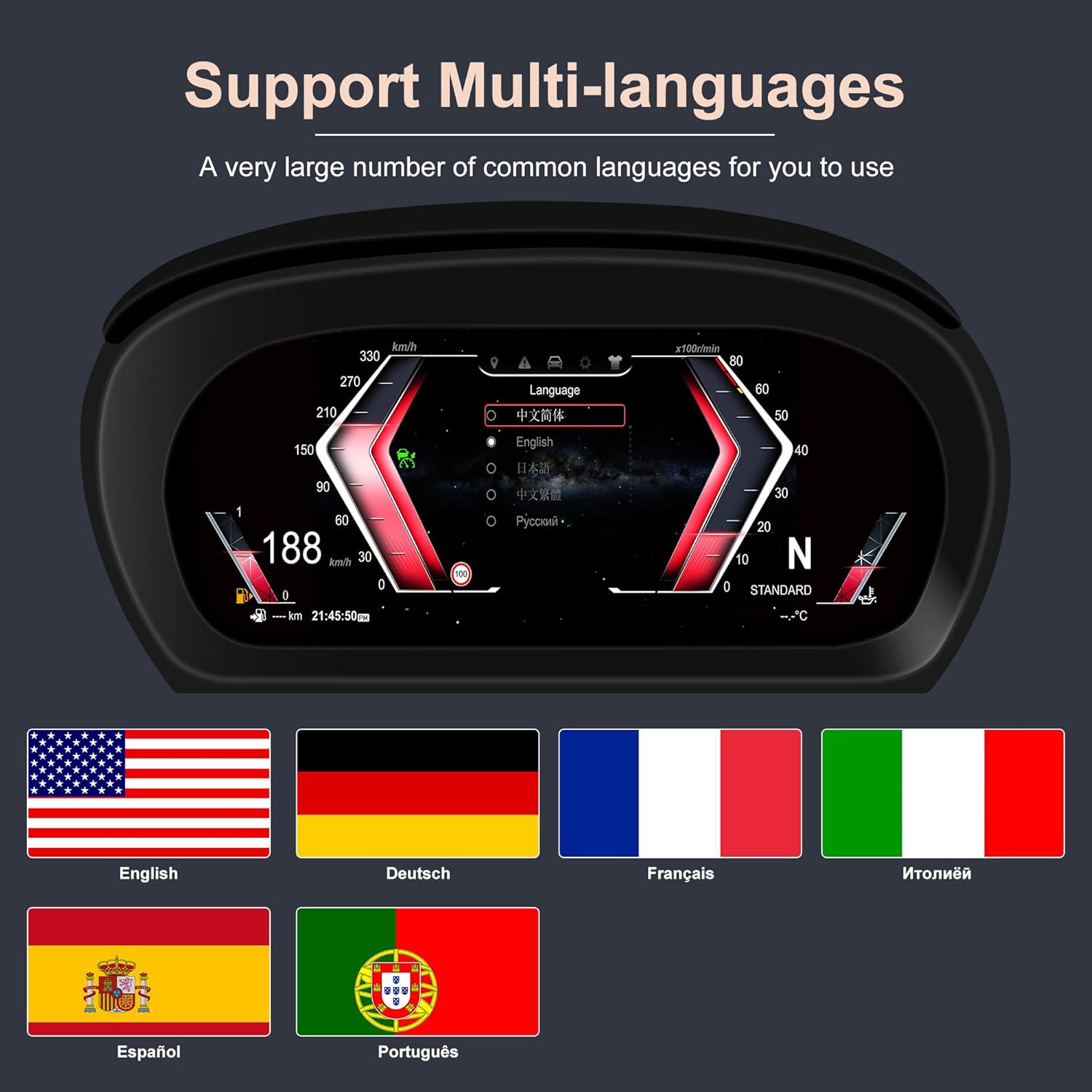 - šØ[Note] This digital display speedometer supports switching between miles and kilometers and offers support for eight languages. It also supports original car control and is compatible with the original car's cruise control function