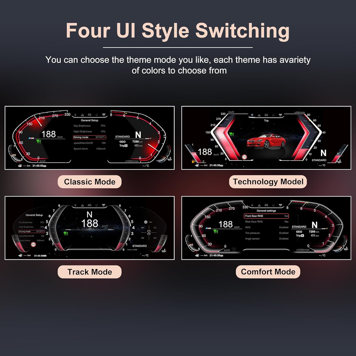- āļø[4 sets of UI styles can be freely switched] This digital cluster odometer features 4 customized modes (simple, comfortable, track, and technology) for the LCD. Additionally, it offers 4 color interfaces (red, purple, blue, and orange) that can be freely changed to enhance your driving comfort. The original vehicle data and information are presented more intuitively