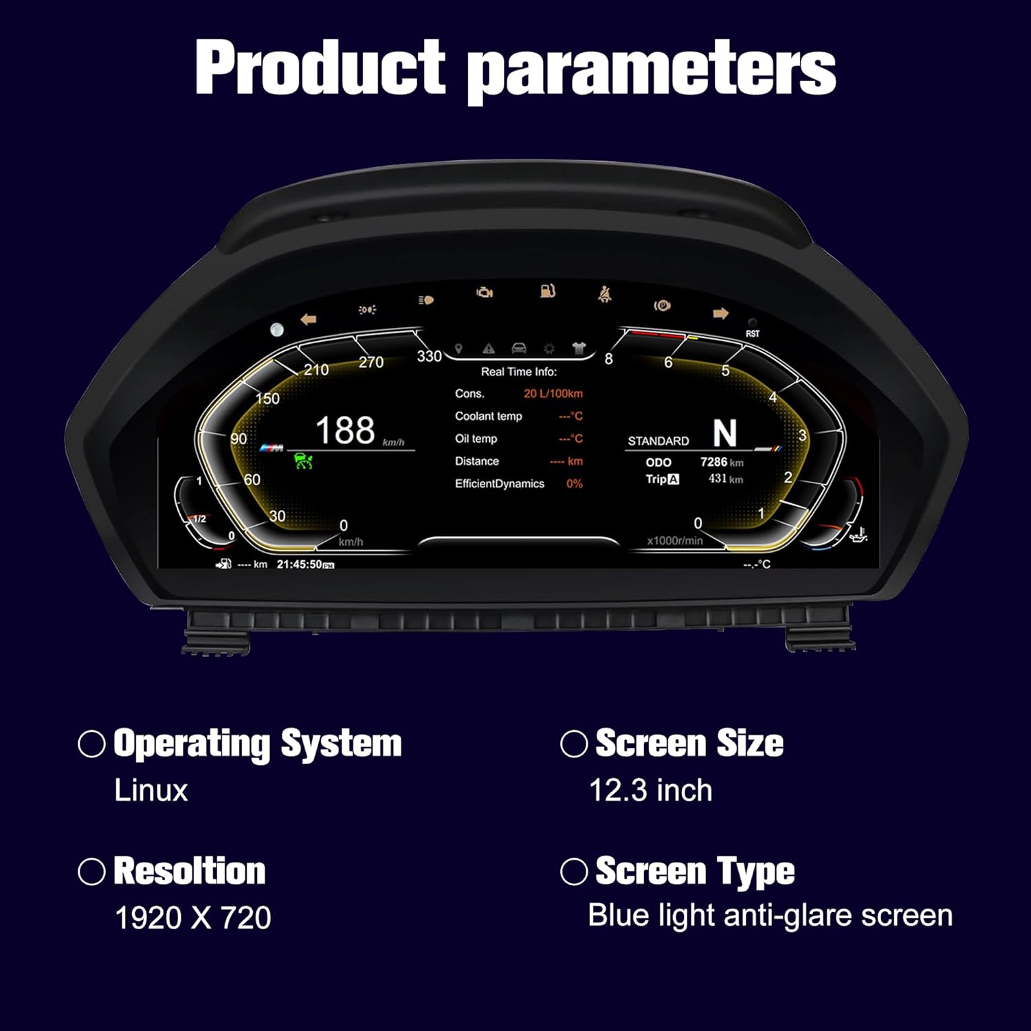 - āļø[4 sets of UI styles can be freely switched] This digital cluster features 4 customized modes (simple, comfortable, track, and technology) for the LCD. Additionally, it offers 4 color interfaces (red, purple, blue, and orange) that can be freely changed to enhance your driving comfort. The original vehicle data and information are presented more intuitively