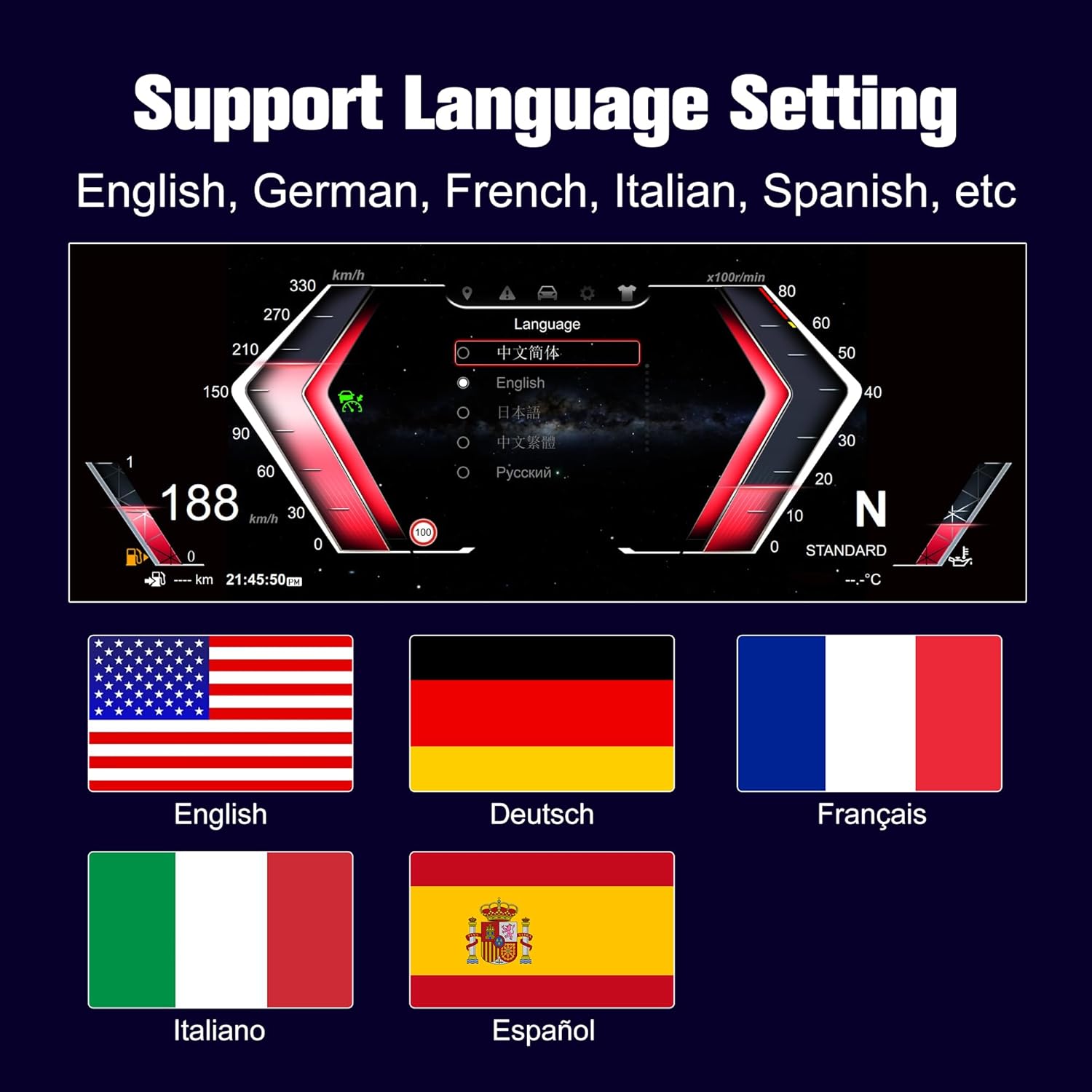 - šØ[Note] This digital display speedometer supports switching between miles and kilometers and offers support for eight languages. It also supports original car control and is compatible with the original car's cruise control function, this cluster doesn't support the HUD function