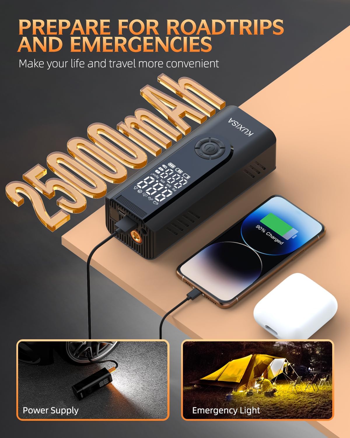 - 【Long lasting battery life】This portable air compressor is equipped with a built-in 25000mAh battery, eliminating the need for an external power source during use. Its inflation speed is three times faster than that of other regular cordless inflators available on the market, while its power is increased by 35%. Additionally, it can be charged via the car's cigarette lighter port, preventing the scenario where the inflator runs out of battery