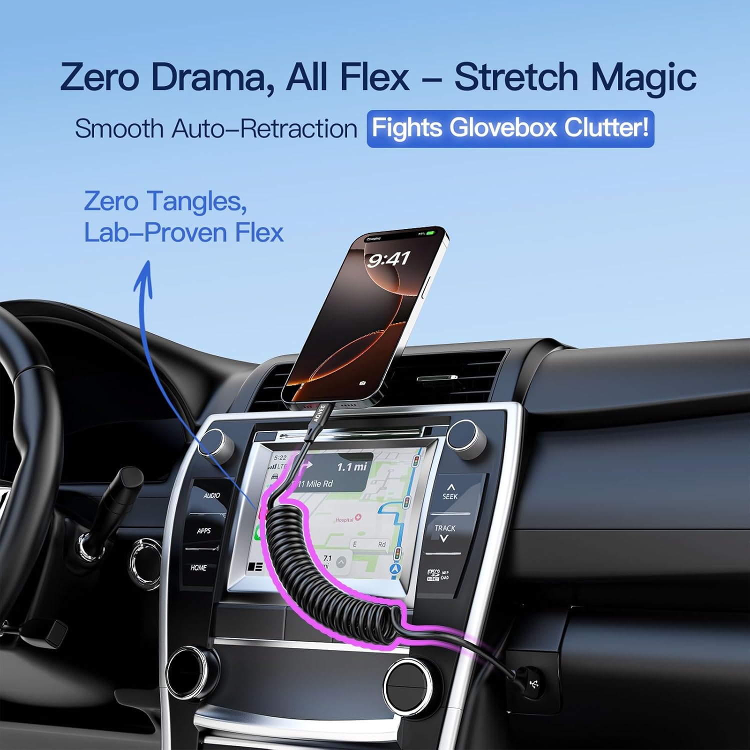 - 🚗[Tame Your Car's Cable Jungle] No more wrestling with spaghetti cords! Our coiled design stretches from short to long, perfect for tight car spaces, then snaps back neatly like a slinky. Keep your cup holders free for coffee, not tangled chaos! Soft and elastic: No more wrestling with stiff, frozen-spaghetti-like cables in winter; Squishy as a pacifier, coils like a zen master.