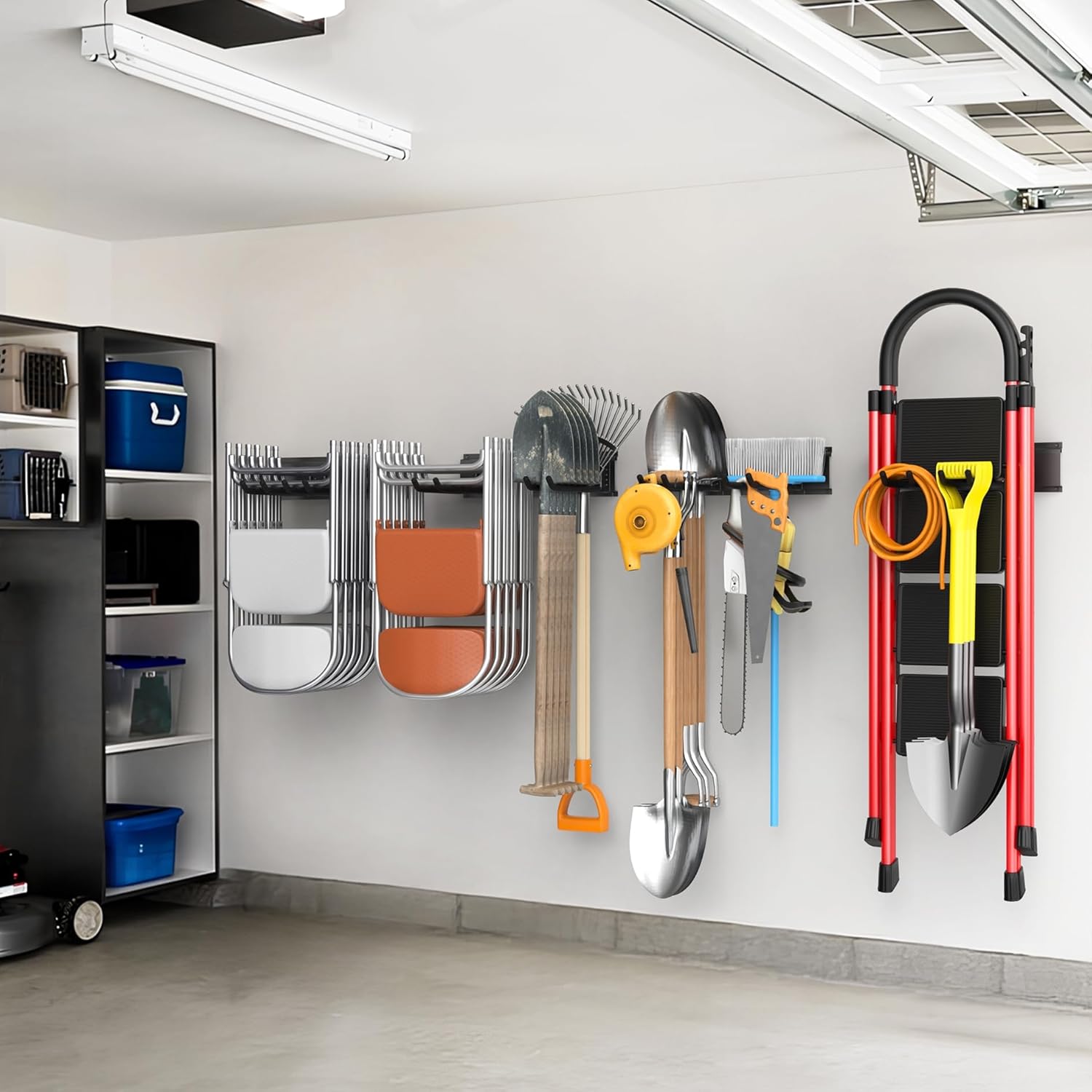- Maximize Your Garage Space: Keep garden tools, ladders, folding chairs, and more off the floor and neatly stored on the wall. This tool rack helps free up floor space while keeping everything organized and within reach