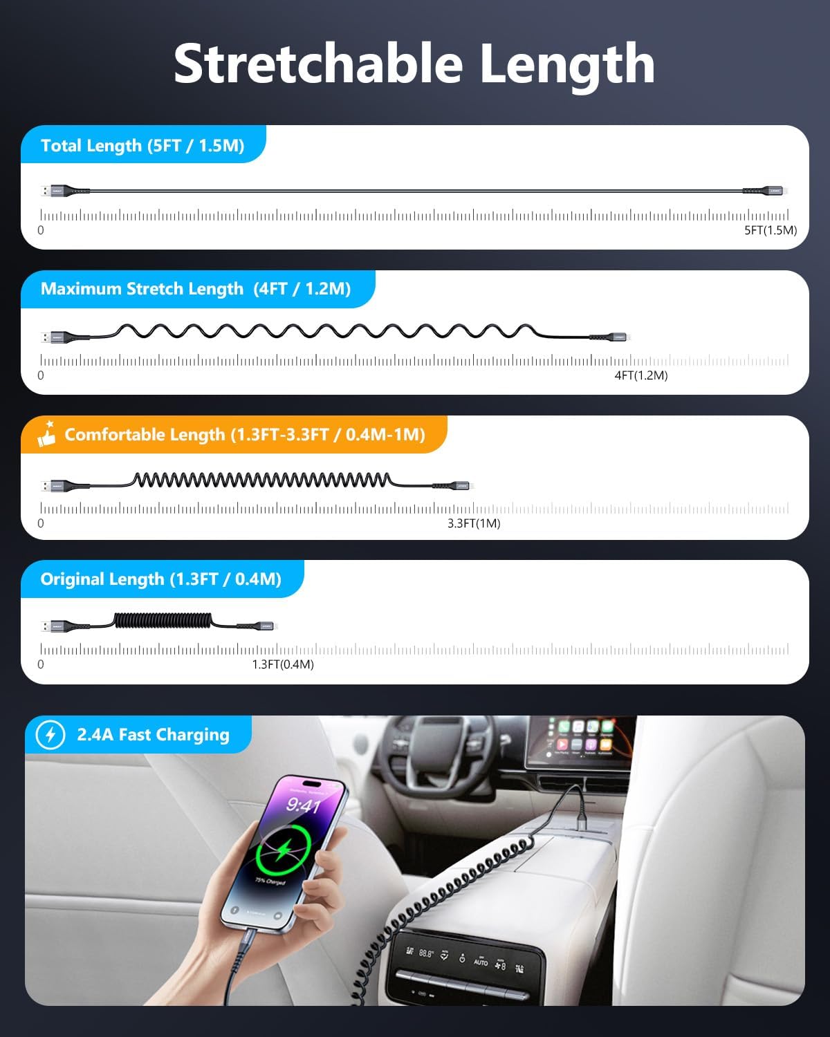 - 【Fast Charging & Data Transfer】This coiled lightning cable provids Max 2.4A fast charging and USB 2.0 480Mbps data transfer. ⚠️Tip: For best results, gently stretch the coiled cable 3-5 times before first use to achieve optimal length and flexibility.