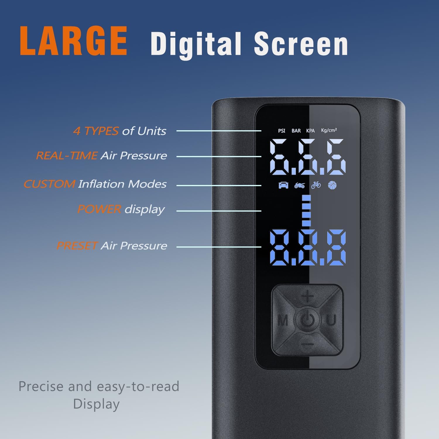 - 【Upgraded Tire inflator】: Air pump equipped with large screen and tire pressure gauge feature.Dual values for easy read pressure preset value and real-time pressure value,measurement accuracy ±1 PSI for safer inflation.LED light press [U] within 3 seconds can be turned on it provides a good light source for you in the dark.