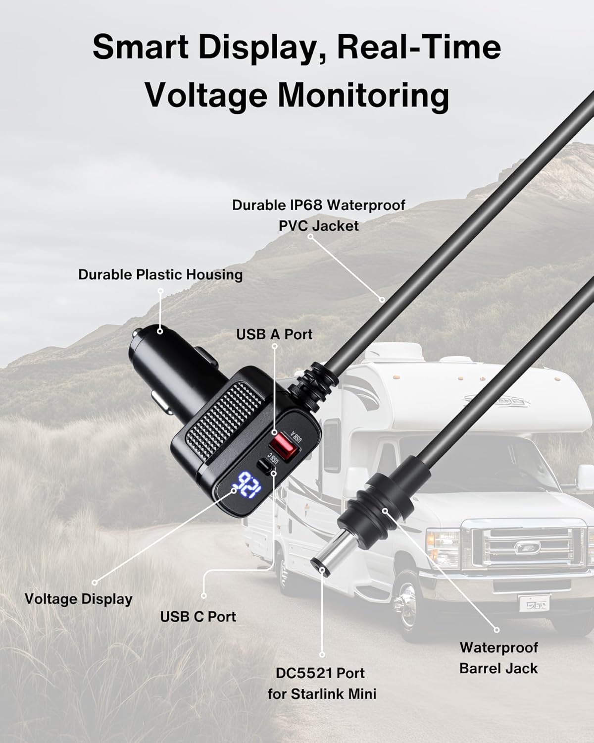 Car Charger Cable for Starlink Mini 16.5FT with Display - 12-24V Cigarette Lighter to DC Power Cable, 60W DC + 33W Dual USB-C/USB-A Adapter for Trucks, RVs & Boats, 18AWG Cord with Voltage Monitoring