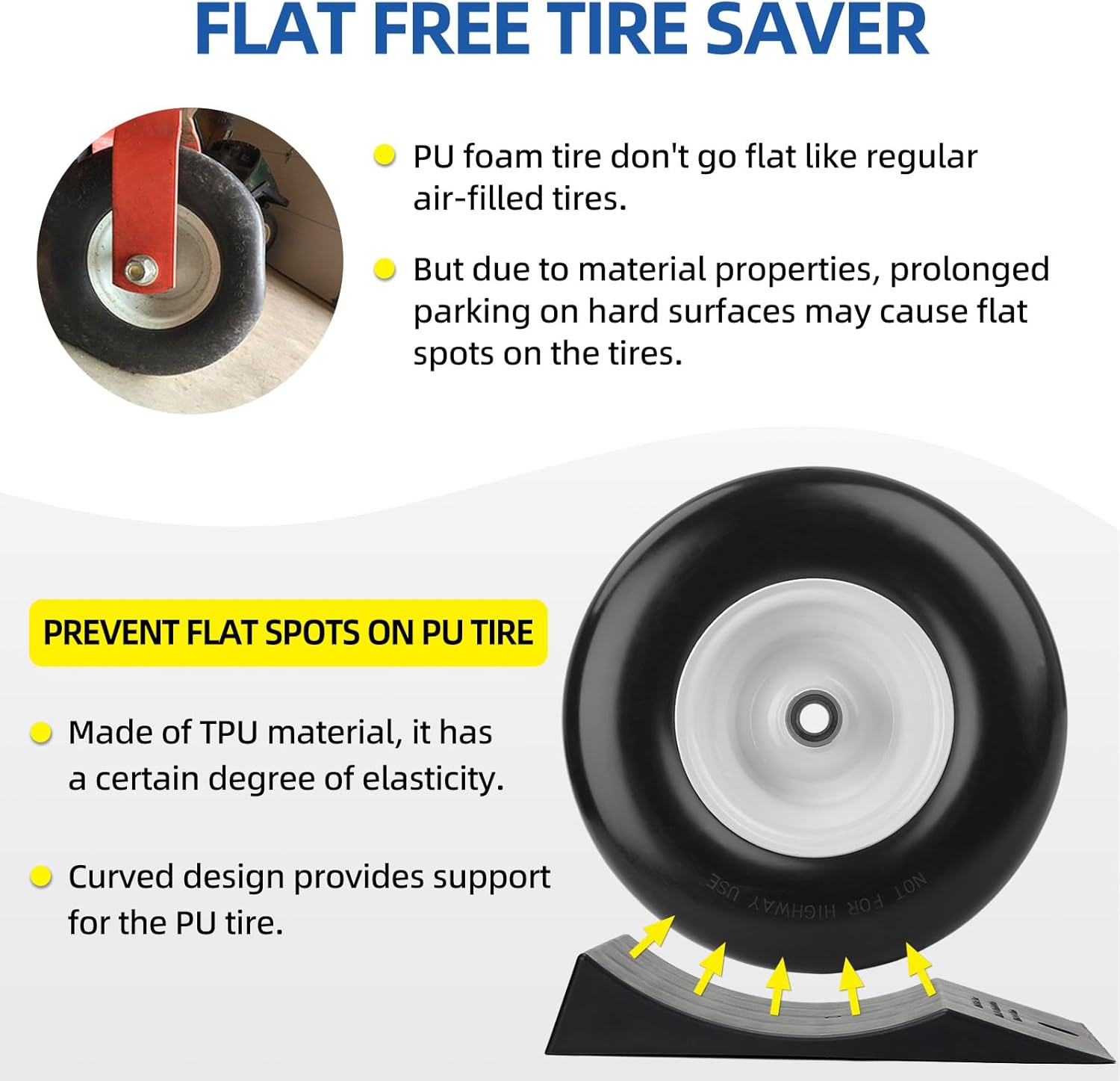- Prevents Tire Flat-Spotting – The specially engineered curved surface fully matches the shape of 9-12 '' flat free tires, preventing the issue of flat spots on PU foam tires caused by prolonged parking on hard surfaces under high temperatures