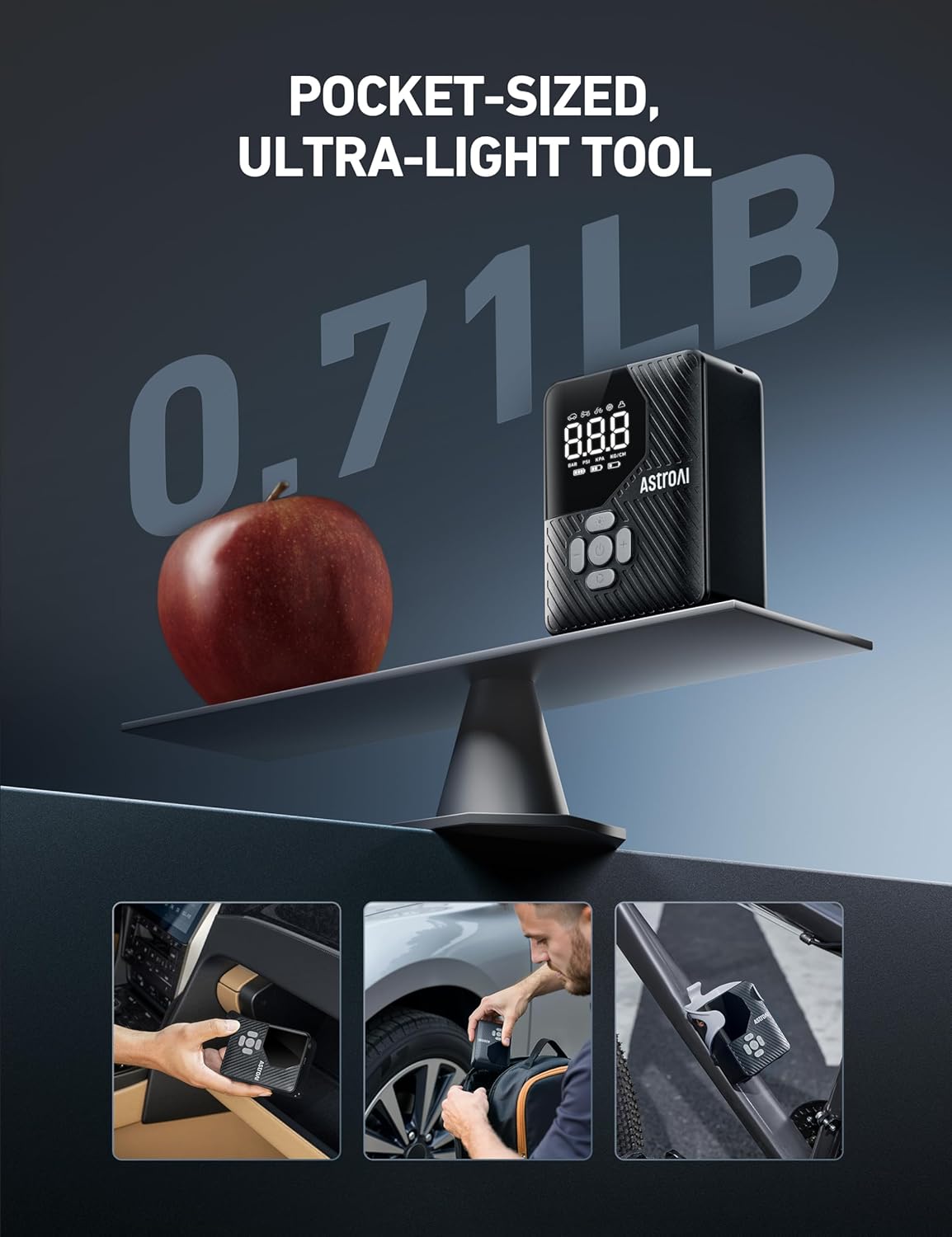 - COMPACT SIZE & MASSIVE POWER: This palm-sized tire inflator weighs less than an apple but is massively powerful. It can inflate a car tire (30PSI-36PSI)/bicycle tire/swim ring in 60 seconds. Grab this versatile tool and go! It’s perfect for camping, traveling, and other outdoor activities.