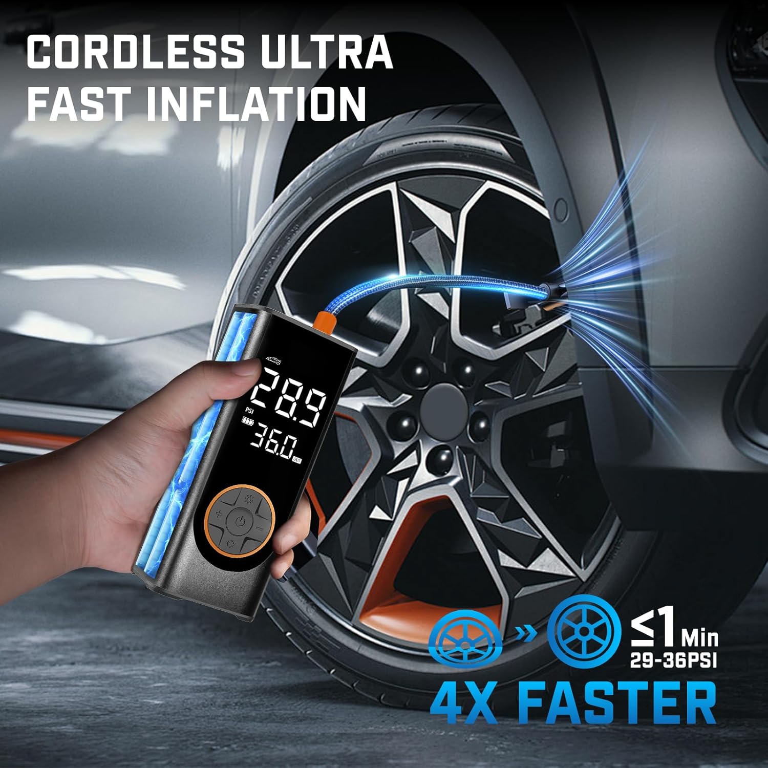 - 🛞 4X Fast Inflation & 5 Modes: This tire inflator portable air compressor delivers a maximum 150 PSI & 35 L/min airflow, inflating a car tire (29-36 PSI) in under 1 min. Features 4 preset modes: car, motorcycle, bike, and ball.