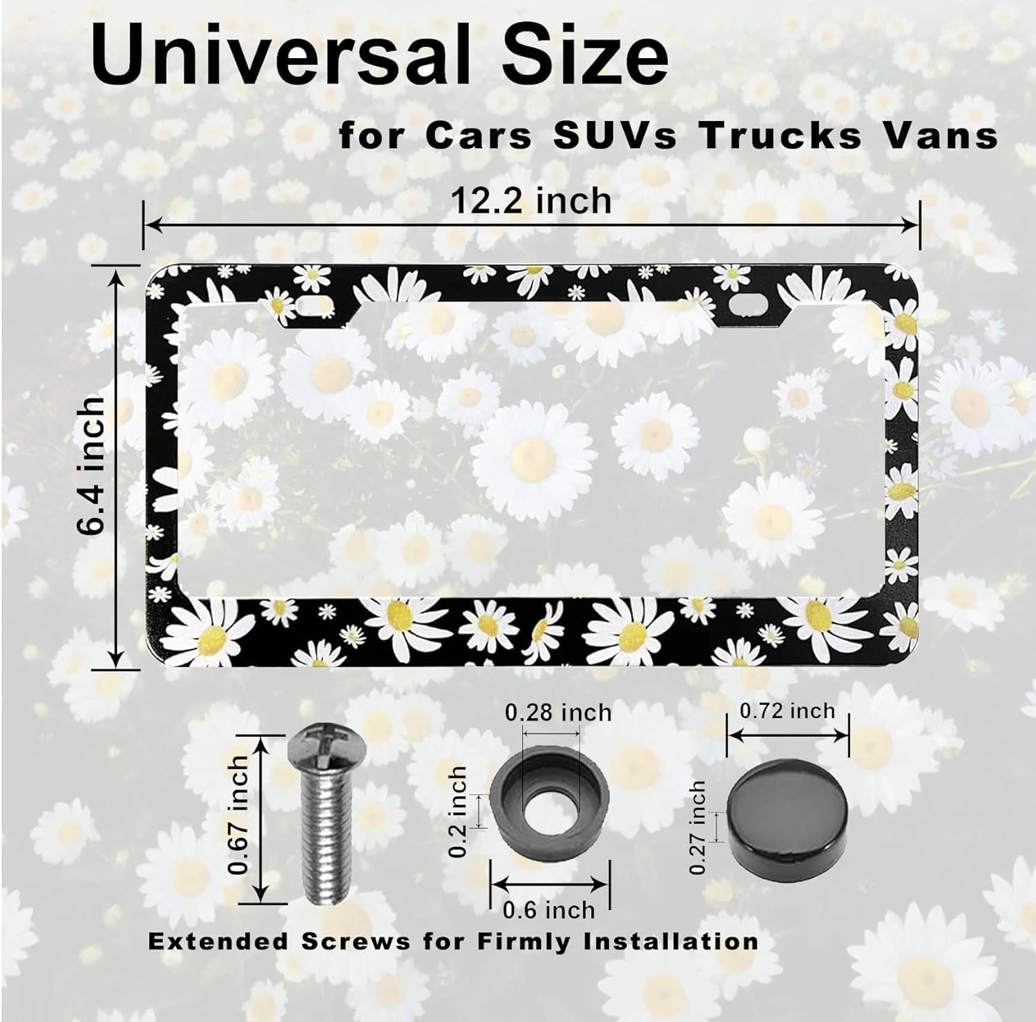 - PACKAGE CONTENTS: Set of 2 Daisy license plates frame and mounting accessories, designed specifically for drivers who want to add style to their vehicles.Little change on the plate, big joy on the road!