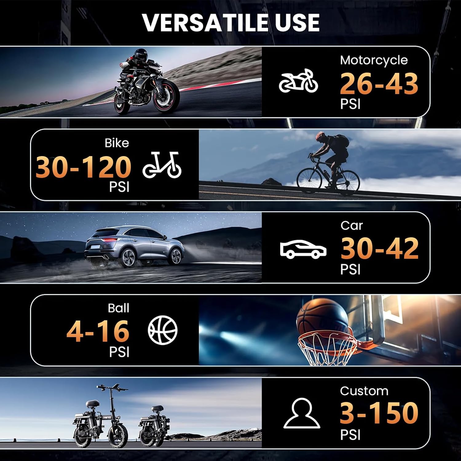 - ๐4 Inflator model๏ผThe Air Compressor has four pressure units: PSI, KPA, BAR, KG/CMยฒ, and four preset inflation modes for bike, motorcycle, car, and ball. You can freely set the pressure of the four preset modes according to your vehicle and ball up to 150 PSI.