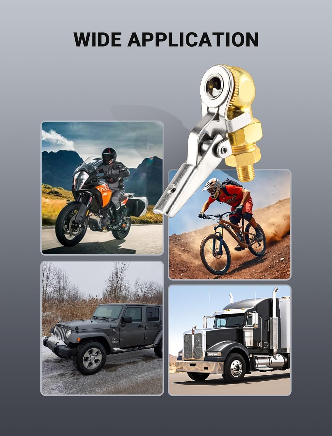 - 【Hands Free & Easy Operation】: This air compressor chuck comes with a steel lock-on clip, which offers a more ergonomic angle for easily holding the chuck in place on the valve stem during air filling operations and making inflation effortless.