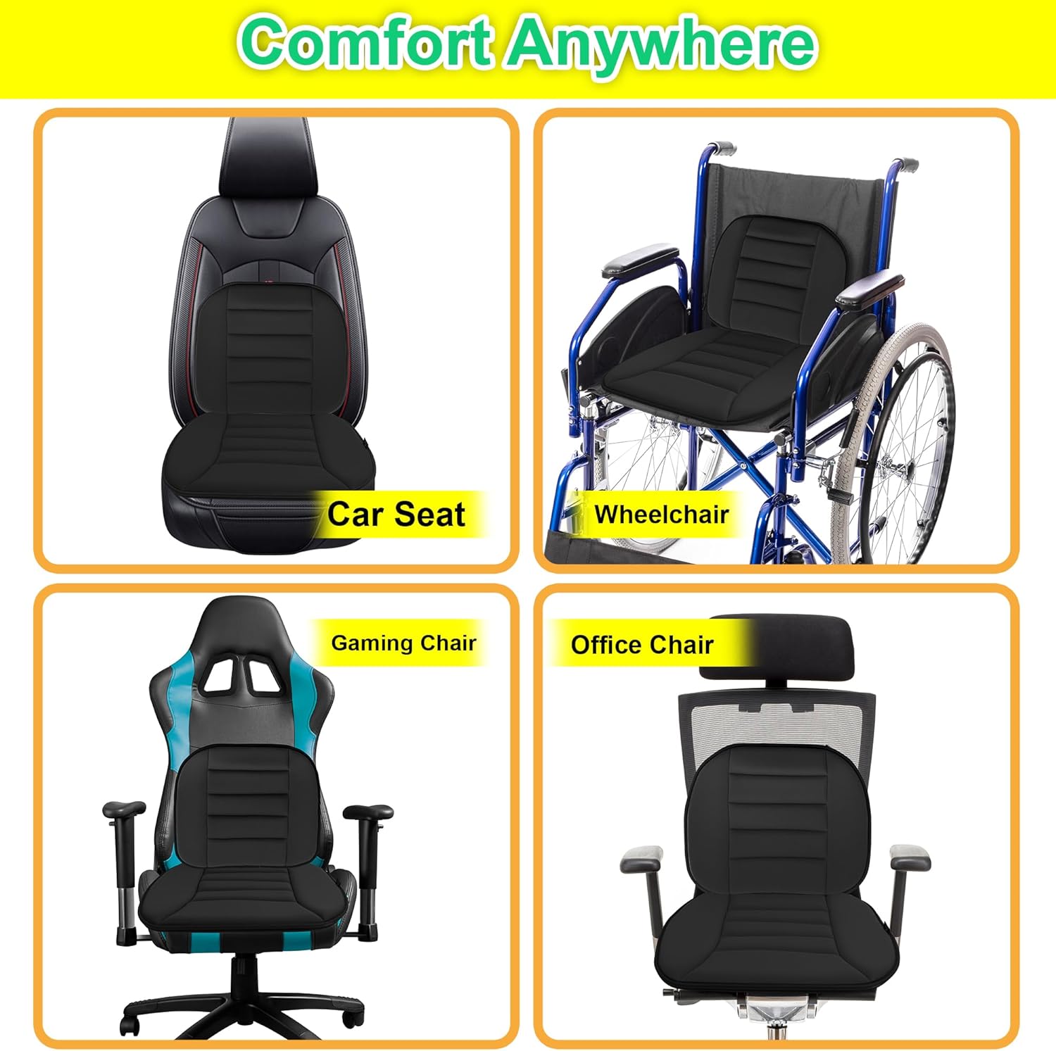 - PAIN RELIEF AND POSTURE SUPPORT - The chair seat cushion and lumbar support pillow are expertly crafted to alleviate discomfort in the lower back, lumbar area, tailbone, and sciatic nerve, promoting healthier and more comfortable sitting posture. Designed for versatility, it fit seamlessly into variety of car, office chairs, wheelchair and gaming chair ensuring optimal comfort wherever you sit