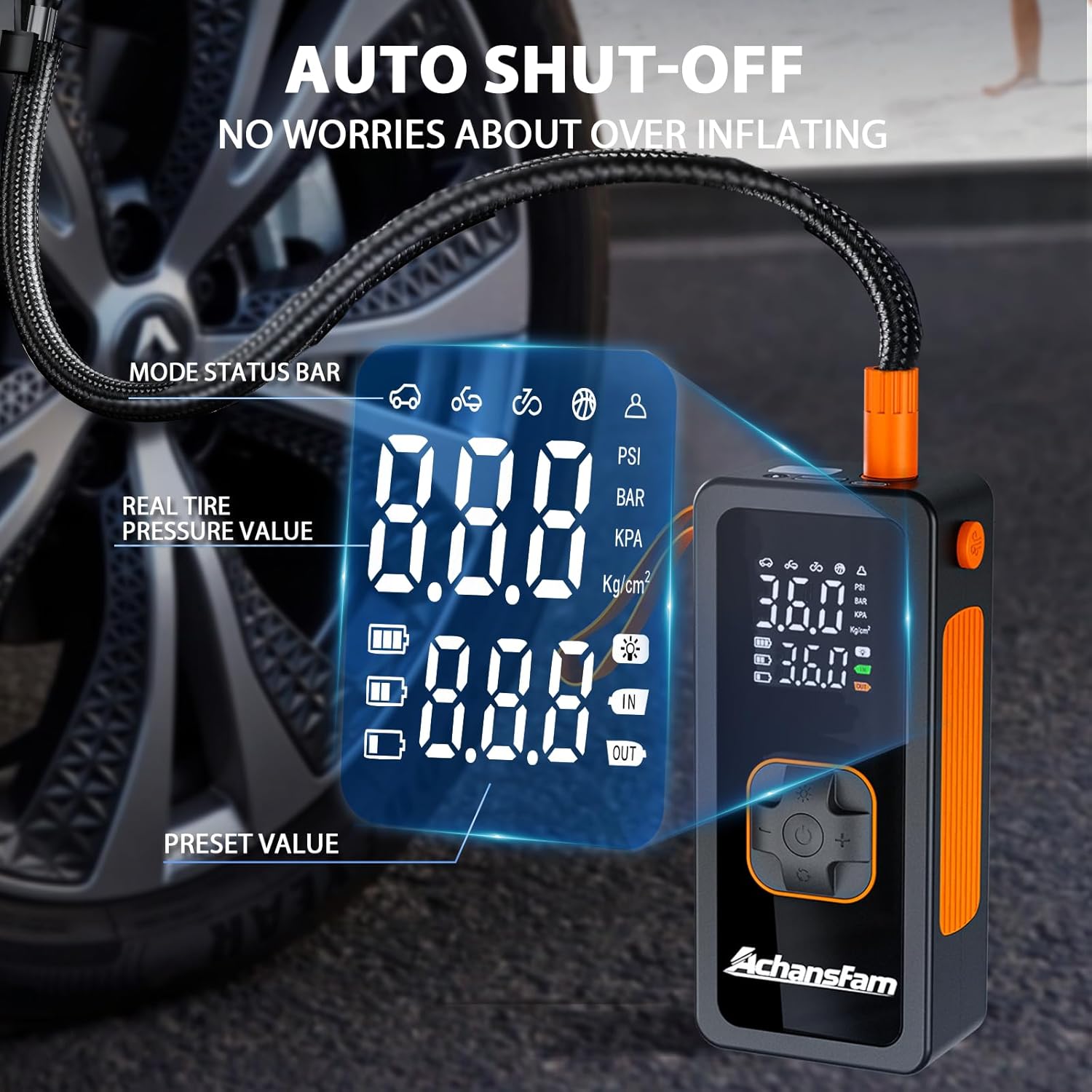 - Air Compressor: Say goodbye to the hassle of short air hoses! Our portable tire inflator features an extra-long air hose that easily reaches tire valves—even those at the top of the tire. Our design ensures smooth airflow without the need for awkward adjustments while inflating.