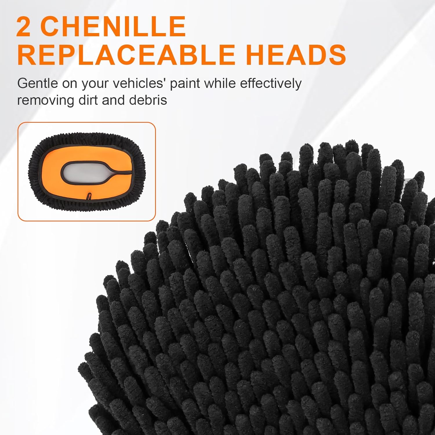 - Super Soft and 4cm Microfiber Bristles: 4cm long, ultra-soft chenille bristles will not stick the sand and dust, which is gentle on your vehicle’s paint while effectively removing dirt and debris. The microfiber material built-in thickened sponge is highly absorbent, for better use effect, wash the chenille brush head with clean water before use